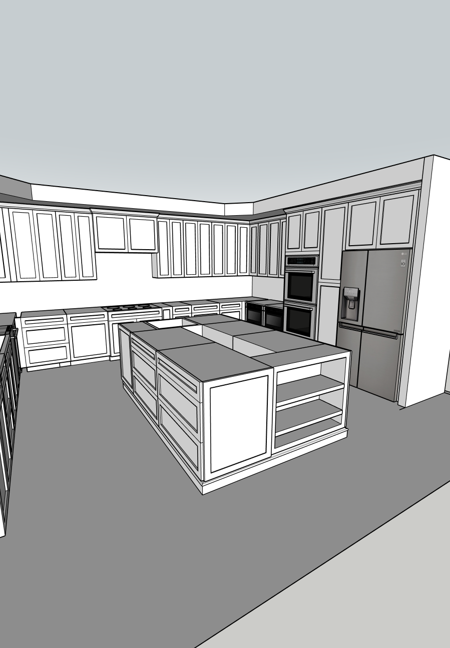 convert this sketchup kitchen model into a photorealistic interior render while preserving the exact cabinet layout and geometry apply chestnut stained maple cabinets with a rich natural wood grain add polished dark granite countertops and a full granite backsplash include stainless steel appliances with a modern brushed finish walls should be clean white painted drywall flooring should be warm oak hardwood planks with subtle grain variation add a finished ceiling with recessed can lighting evenly spaced across the room casting soft warm interior lighting use realistic daylight entering the space to create natural shadows and reflections high end residential kitchen photography style ultra realistic materials global illumination soft shadows detailed textures