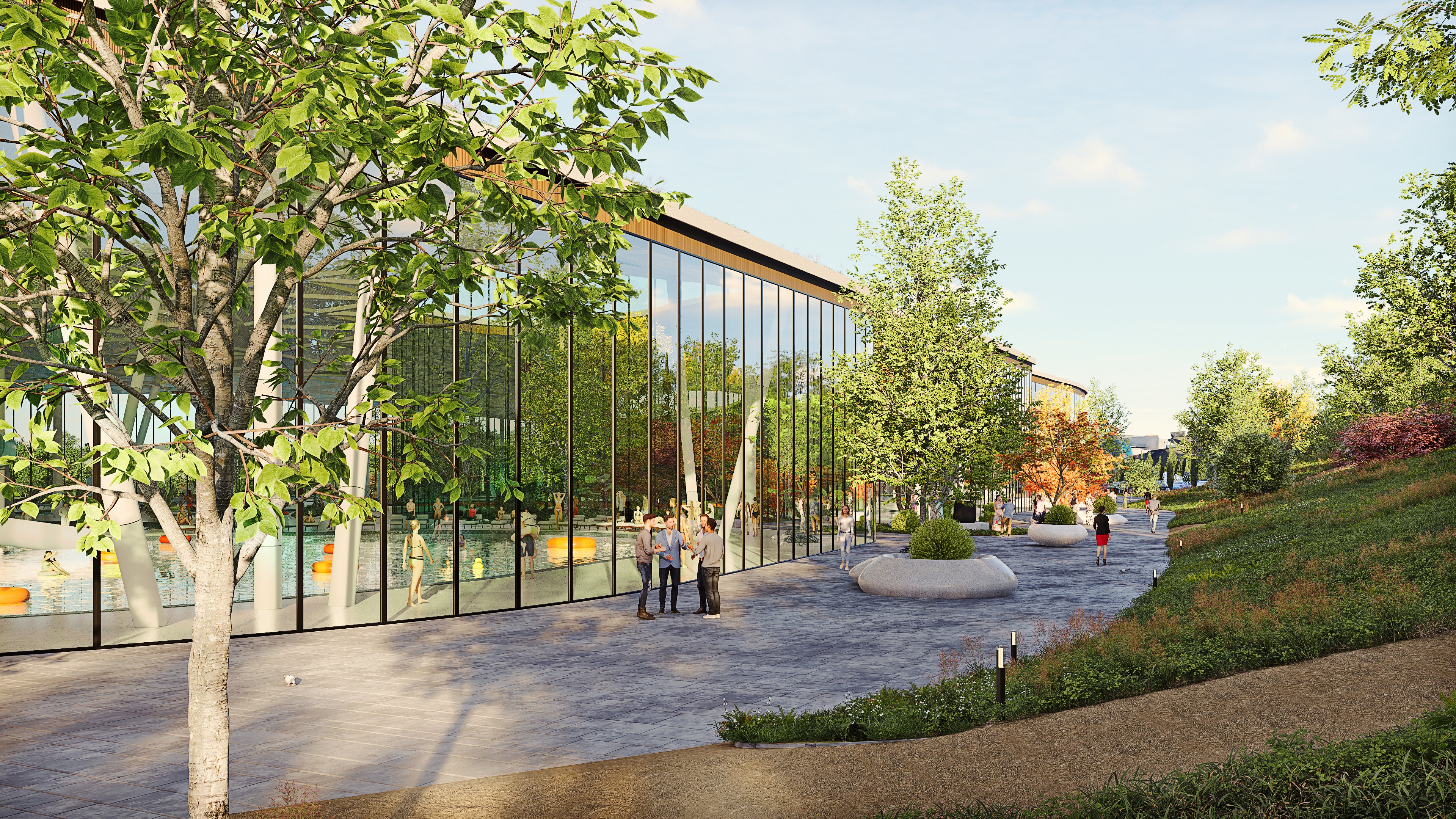 important preserve the existing geometry and the existing context exactly as provided preserve the existing windows do not add new windows do not modify alter reinterpret add remove scale or reshape any geometry do not change the site surroundings street layout neighboring buildings vegetation or context elements do not modify geometry scale proportions buildings road layout sidewalks or surrounding context in any way do not modify text soft sunny noon atmosphere diffused neutral natural daylight with subtle tones cinematic architectural mood weak interior lighting 4000k slight glowing from inside large glass surfaces with realistic reflections soft mirror effect environmental reflections of sky and surroundings important do not add new windows remove the people