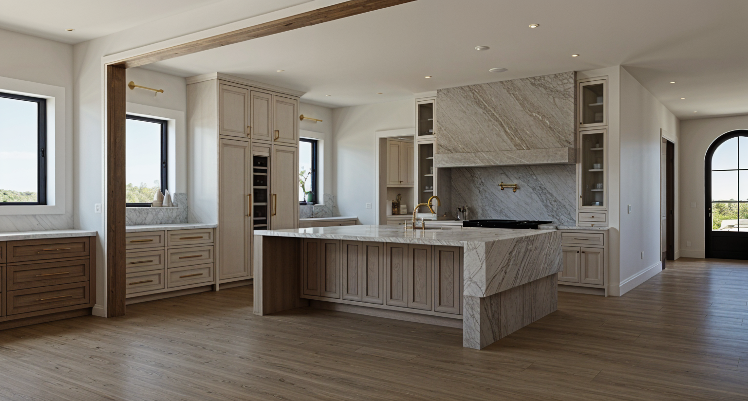 preserve all cabinetry hardware countertops marble veining appliances flooring glass window frames and lighting exactly as shown do not change any materials textures or colors only enhance realism with soft natural daylight subtle shadows refined reflections on marble and metal and gentle color depth no redesign no material substitution only hyperrealistic enhancement