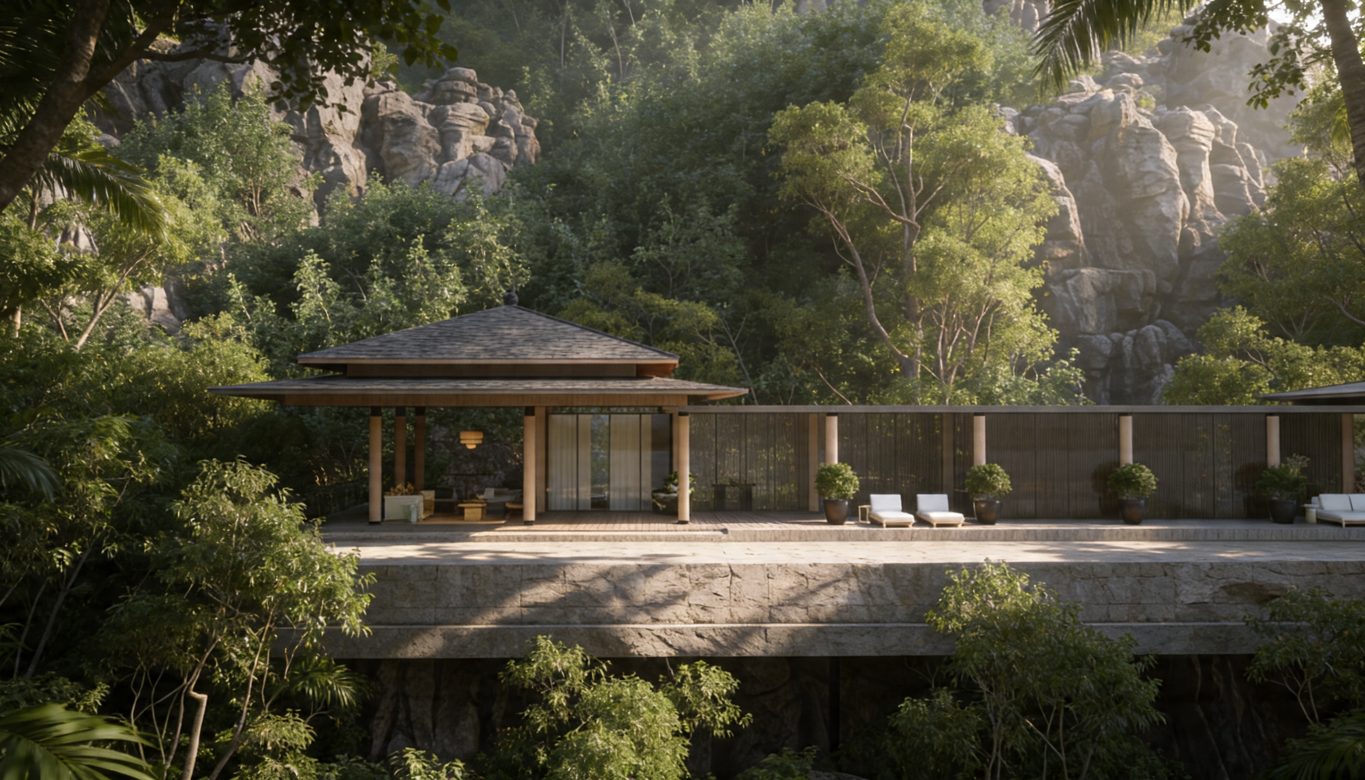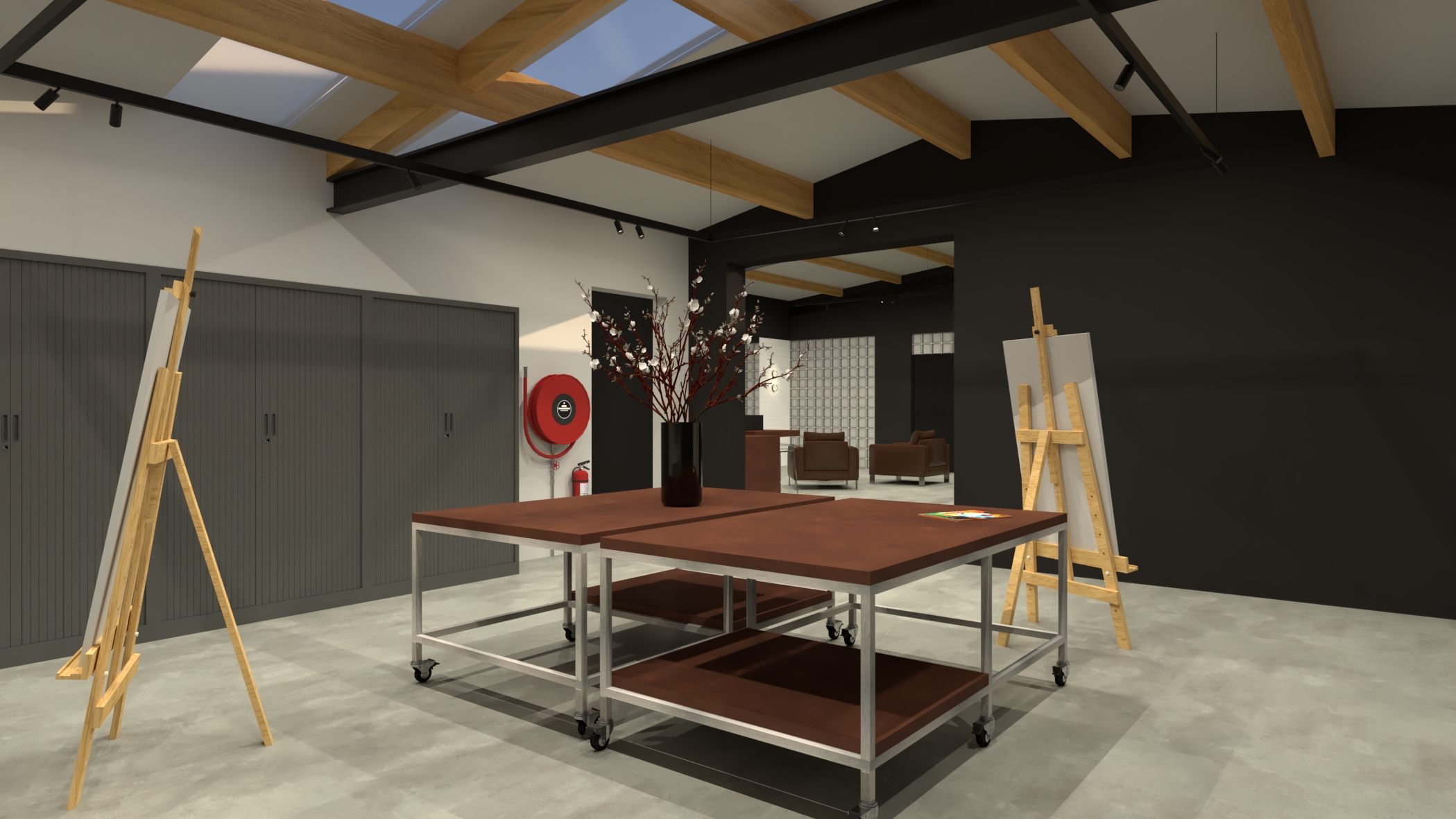 i want a realistic image of this render nothing may be changed about the content of the image only make it look realistic the floor is lightly polished concrete the white part of the ceiling should have a cellulose spray ceiling texture the ceiling also contains sections of structured glass natural light should be able to pass through these areas