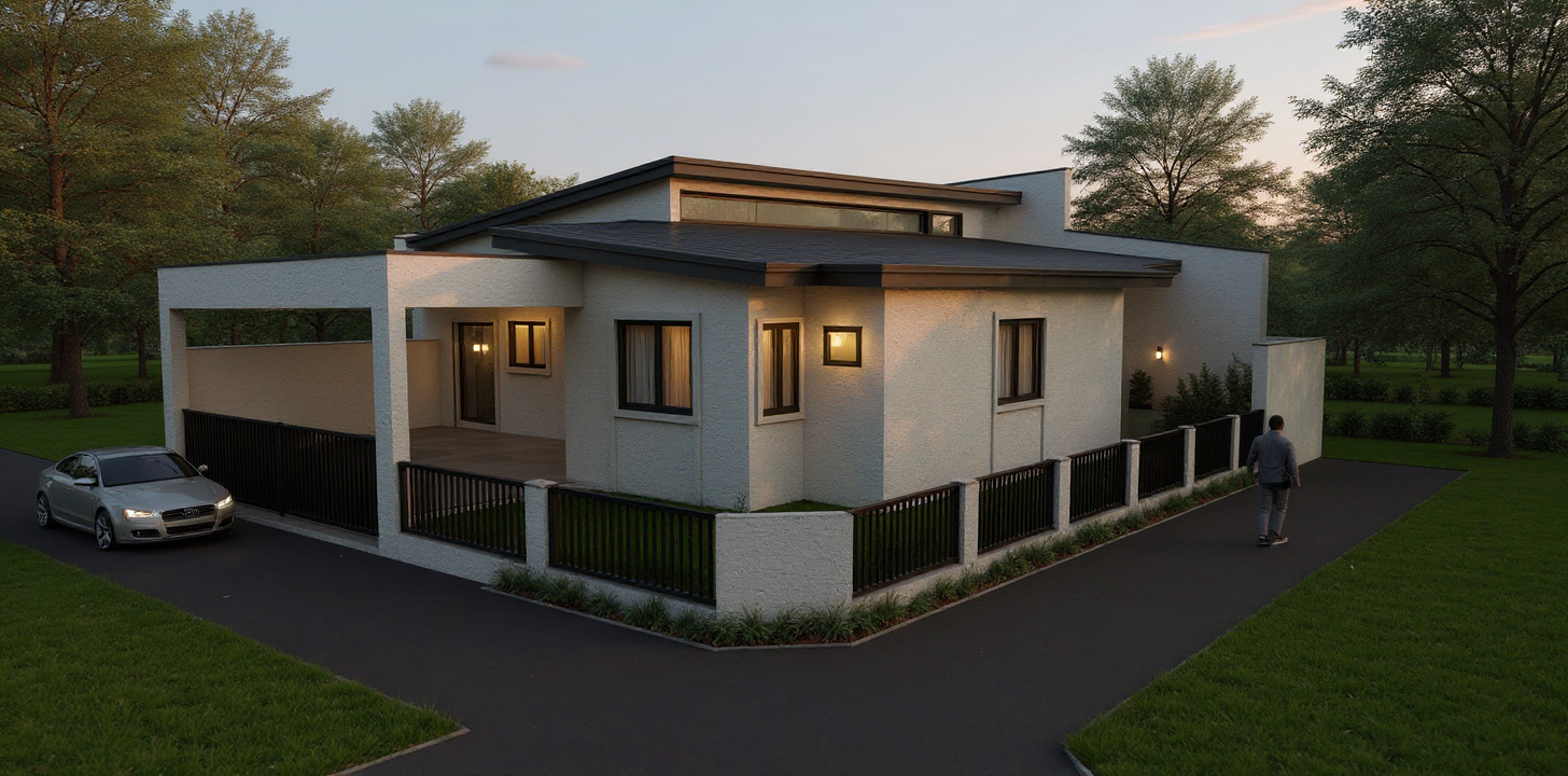 daylight architectural perspective of a modern building surrounded by lush trees and landscaping add several people and cars passing by naturally to show scale and activity emphasize the exterior materials textured white paint on all main wall surfaces and smooth plain white color for window moldings bright even daylight with soft shadows photorealistic detailing high realism crisp textures accurate reflections 8k resolution