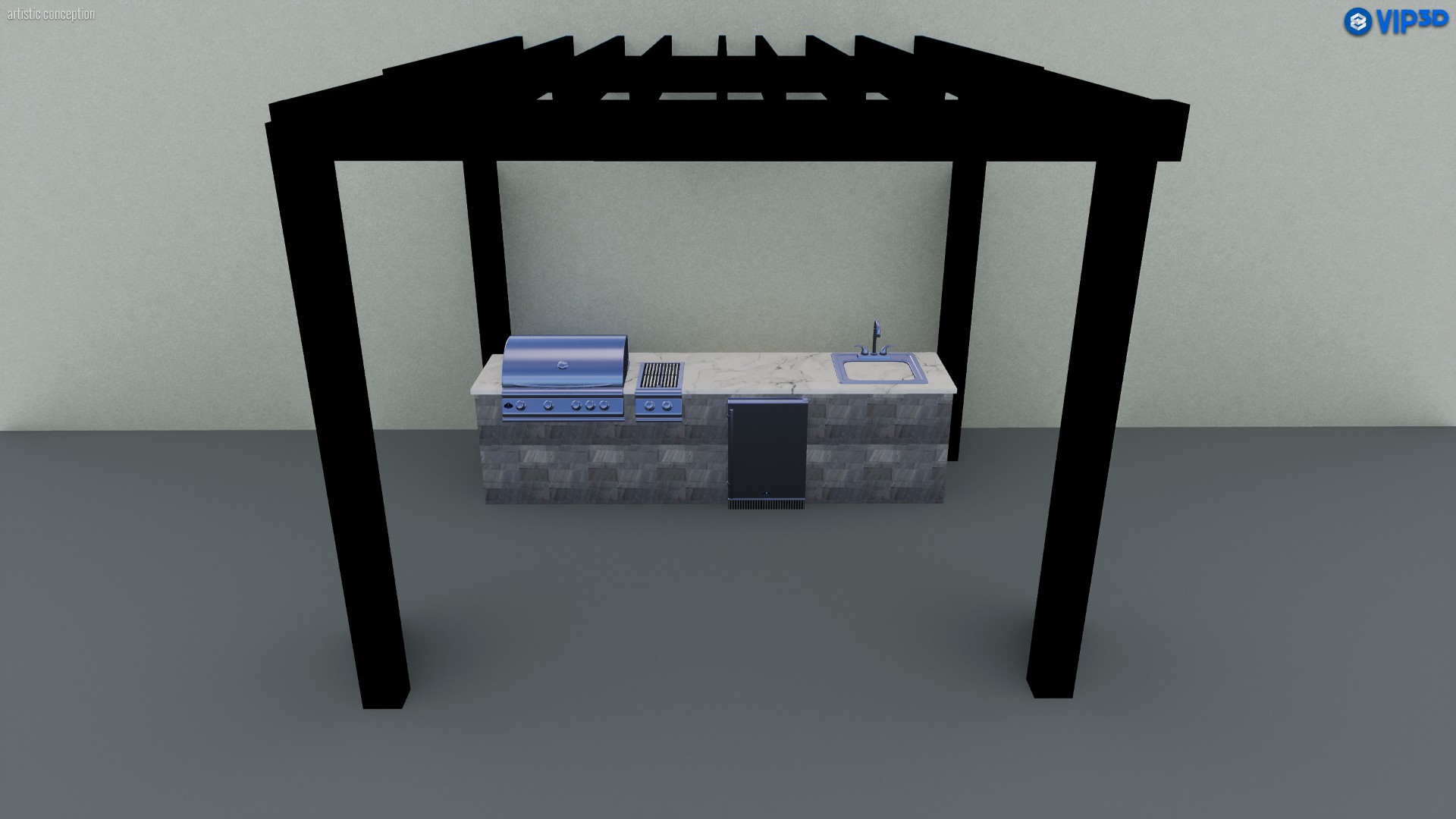make this pergola and outdoor kitchen into a real photo of a black aluminum pergola over an outdoor kitchen