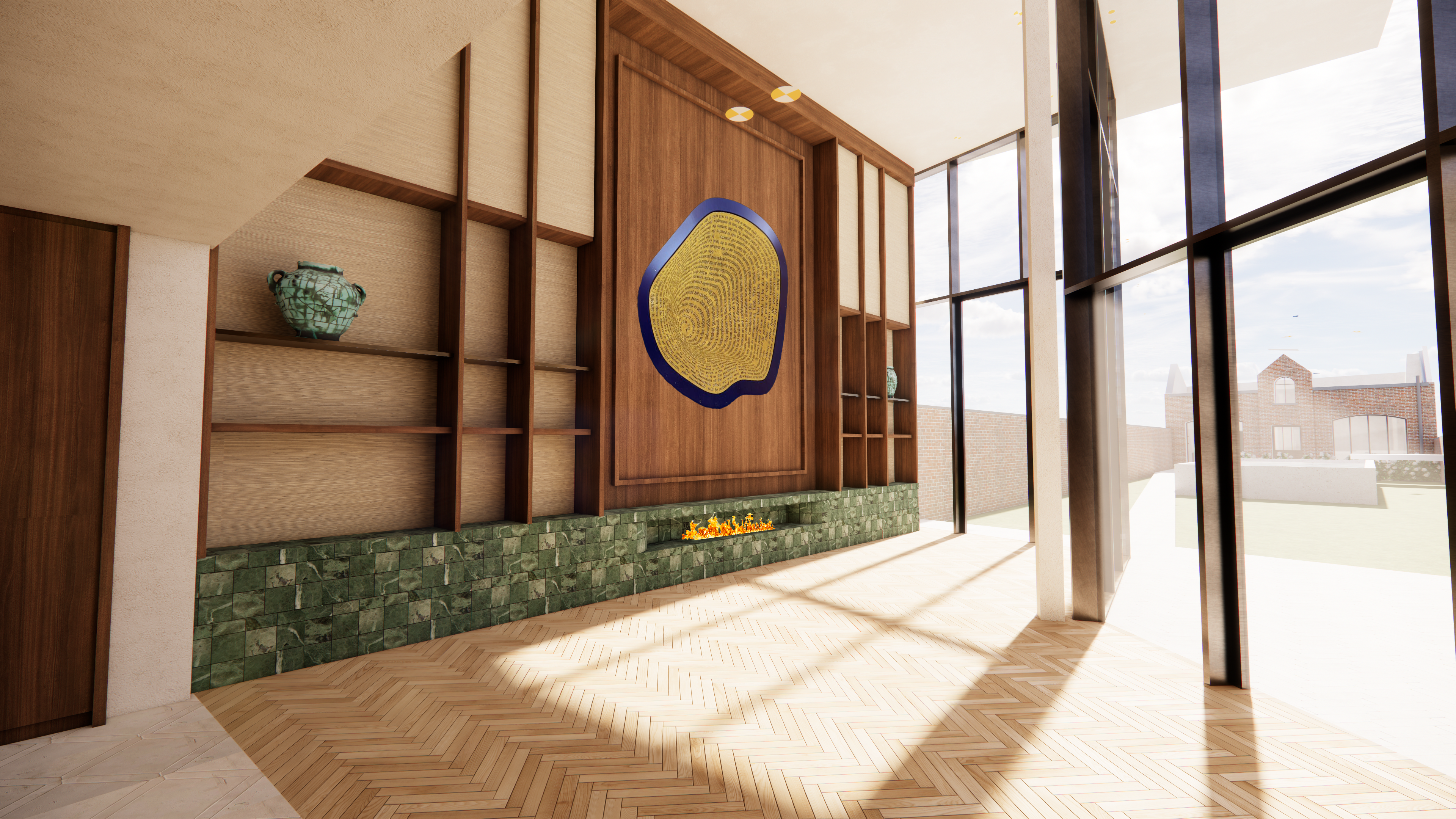 add subtle warm led lighting beneath each bronze shelf to create a soft even glow that gently illuminates the back panel maintain the existing design composition and materials focus solely on refining the lighting and enhancing the rendering for greater realism and a luxurious lifelike appearance additionally make the fireplace flame more realistic with natural movement depth and warm color variation refine the artwork to appear more realistic and harmoniously integrated into the overall scene