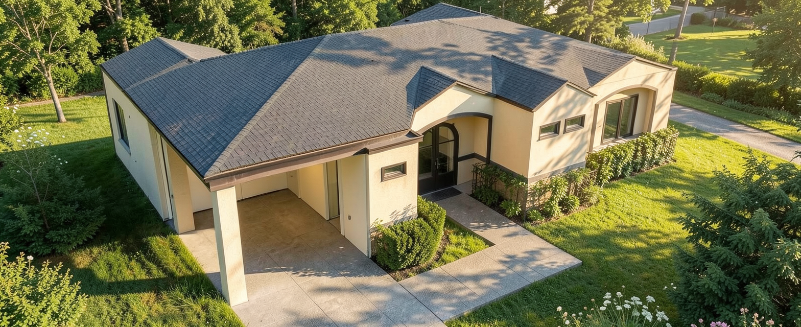 a modern architectural floor plan rendered beautifully with realistic textures and colors use warm soft white for the walls and ceilings the flooring is a combination of light oak wood and classy dark gray tiles the kitchen has sleek matte black cabinets and a white marble countertop the living room features a cozy cream colored sofa and a large window with sheer white curtains bathrooms have glossy midnight blue tiles with chrome fixtures bedrooms are calm with soft pastel tones light blue for one gentle lavender for another the atmosphere is elegant serene and inviting subtle natural lighting fills the space
