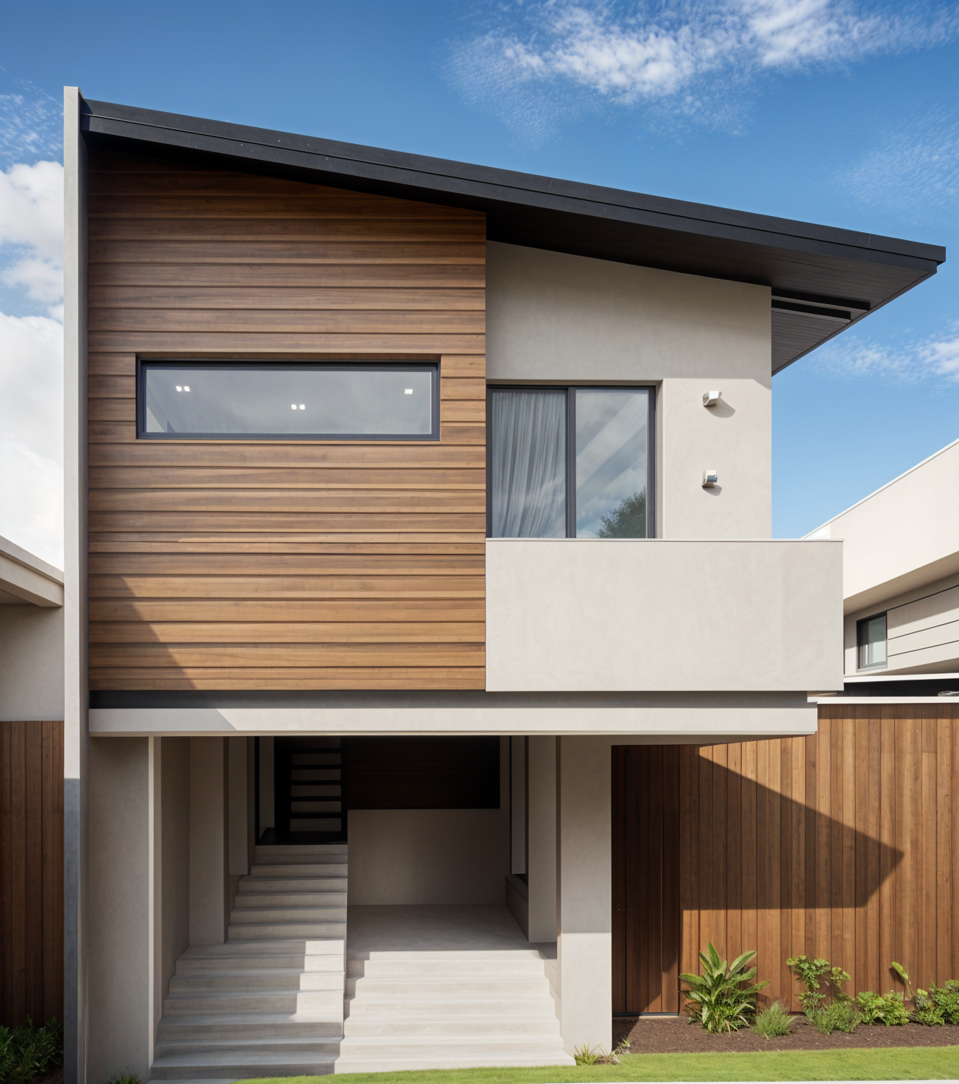 modernist exterior shot realistic rendering of a modern tropical elevated house with terracotta brown paint for both cladding and balcony accented by a warm lighted wall lamp beside the sliding door the ceiling is finished with wood textured pvc for a natural tropical look highlight realistic lighting soft shadows and rich material textures emphasizing the warmth of the terracotta tones against the wood ceiling and neutral surroundings architecture