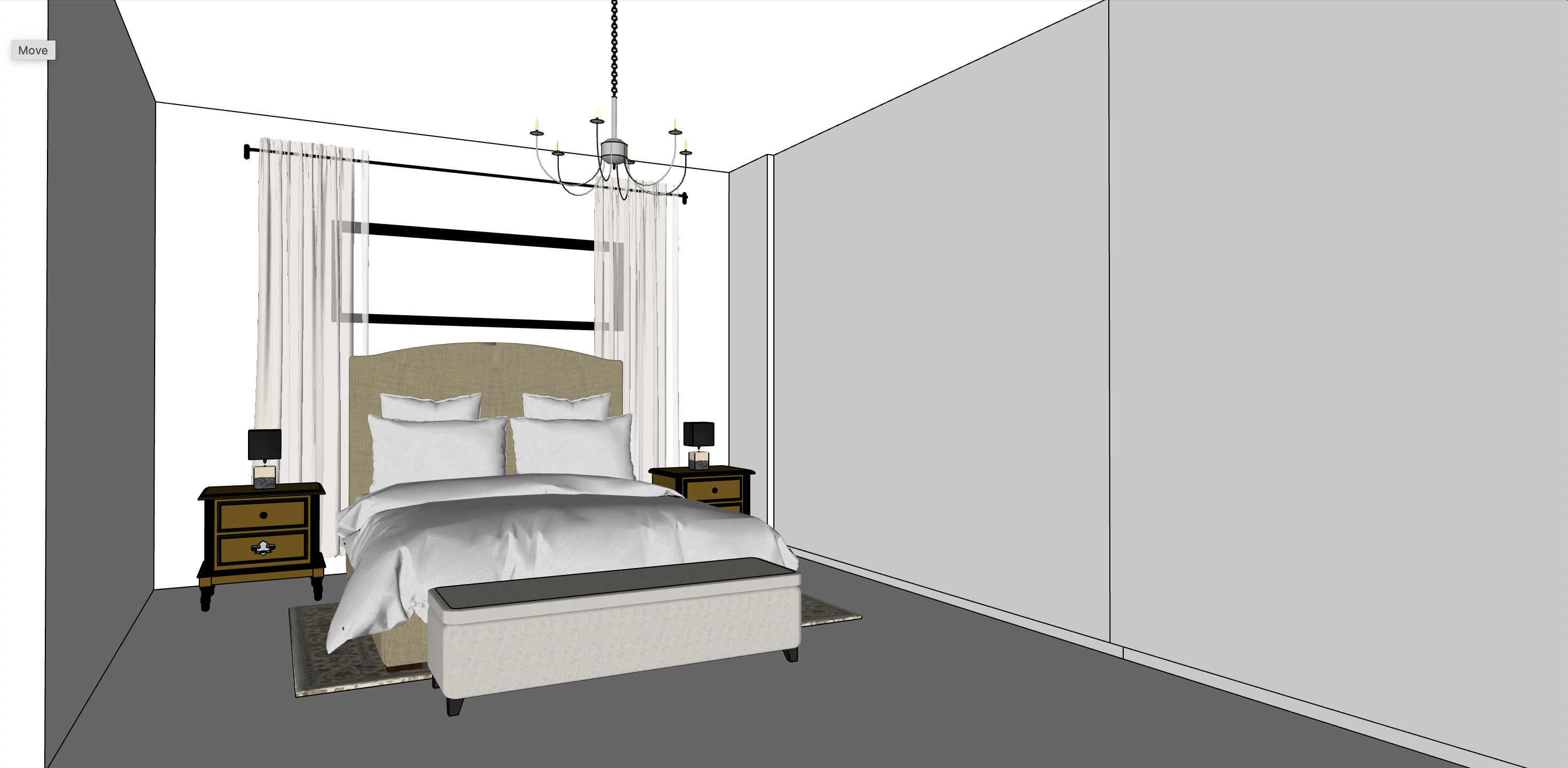create a photo realistic naturally lit rendering of this bedroom keep all walls and ceiling white and make the floor light oak wood on the right wall the far right square is a 15 deep shelved shoe closet with closet doors on the outside on the right wall the middle square is a wardrobe closet that has a double hanging clothing storage racks as well as storage drawers inside the closet on the right wall the far left square keep as is insert trees inside the window that is above the headboard only for the bedside nightstands make all handle hardware the same dark colored knob
