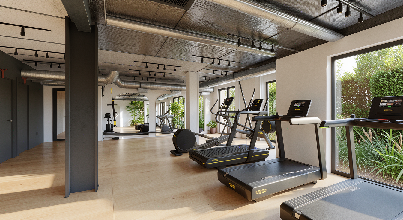 e una palestra a terra abbiamo un parquet in legno rovere chiaro continuo liscio a soffitto ci sono dei tubi in acciaio zincato mentre il soffitto bianco in fondo abbiamo due specchi a forma di arco e spazio libero il pilastro in ferro in primo piano nera siamo al piano terra di un edificio con all esterno della vegetazione