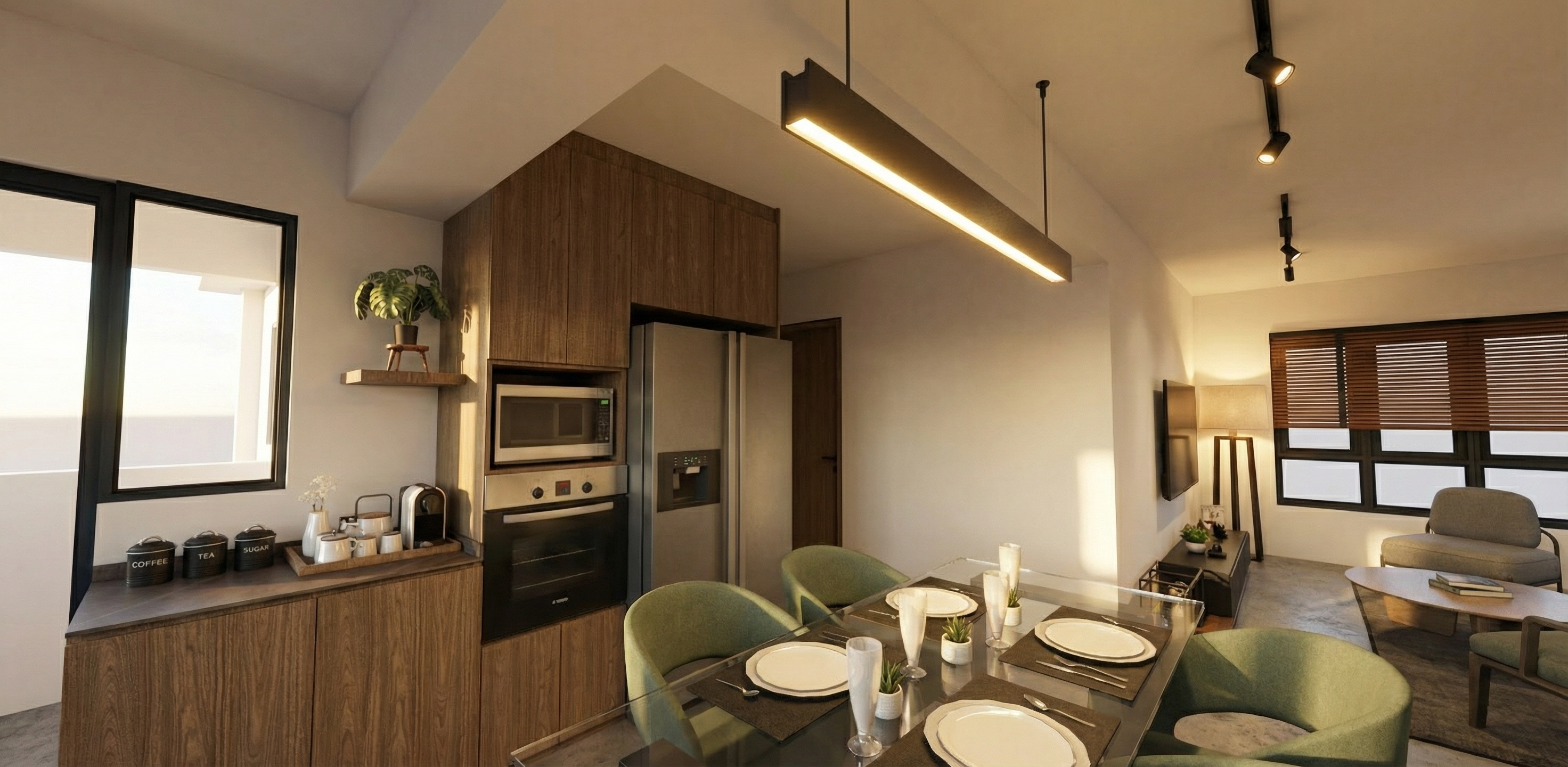 add in black track light in warm lighting to the ceiling behind fridge corridor where a partial bedroom door is seem maintain everything else in the picture
