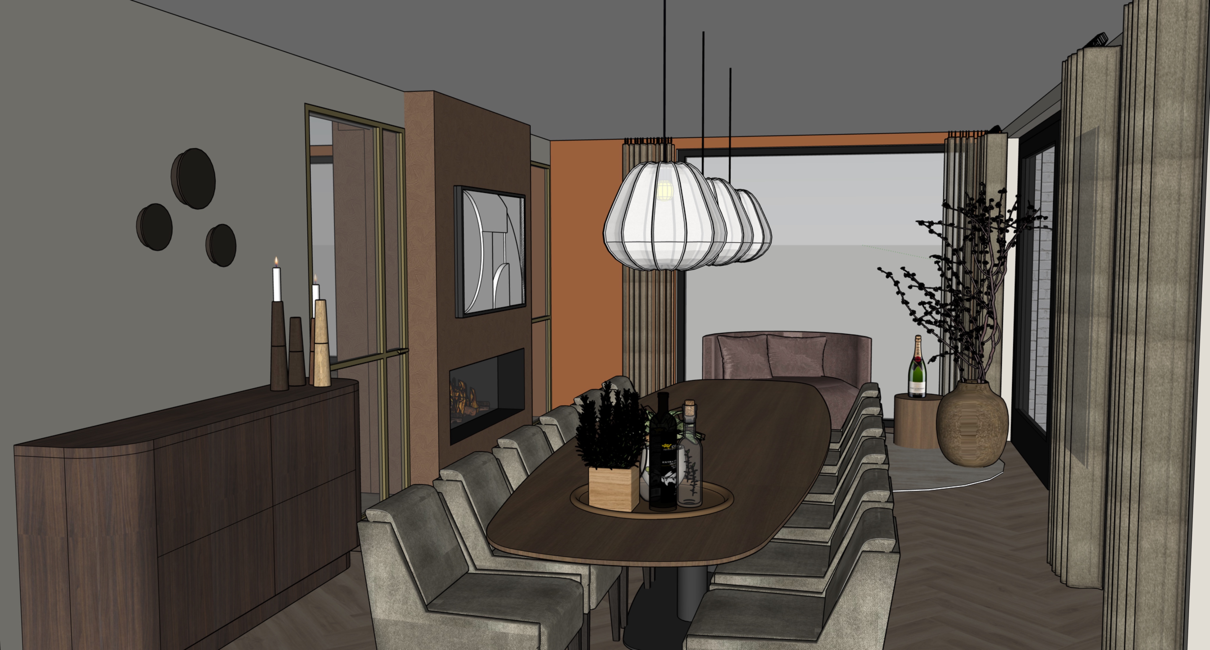 photorealistic render of this interior design with the lights on colors used and natural light trough the windows keep the orange color on the back wall