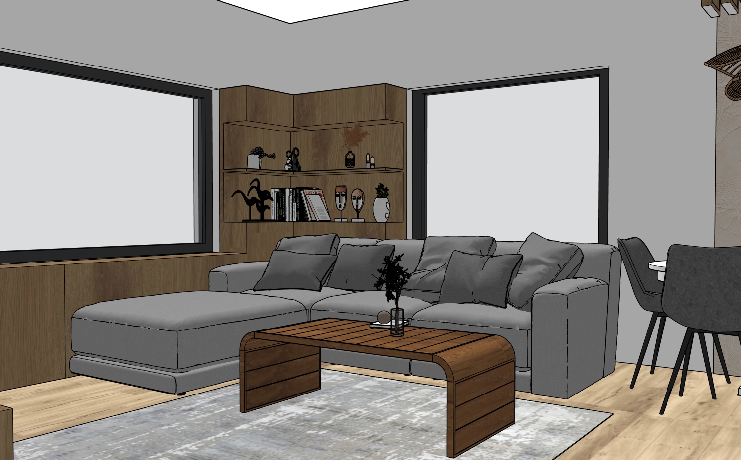 now the kitchen continues with the living room use war wood abience respect the geometry