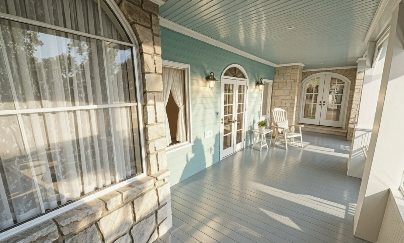 create an extremely realistic rendering of a porch with sunlight shining in the stone should be white