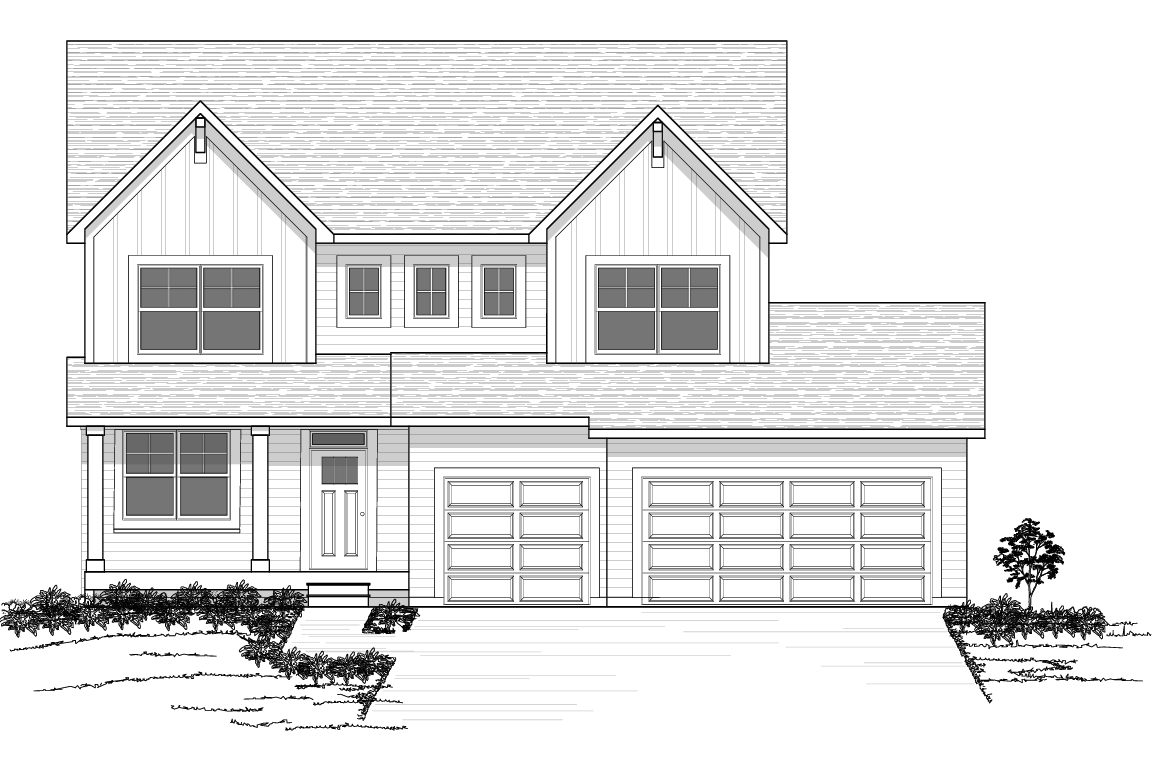 generate a high quality photorealistic render of the provided architectural elevation modern farm house white panels and reflective glass windows framed in matte black stand out elegantly a modern front door in black with windows glass at sunset the atmosphere should be light and airy with clear blue skies and soft sunlight casting soft shadows from the front the surrounding landscape should include lush green grass colorful flowering shrubs and tall deciduous heavy rear trees with autumn colored leaves architecture lights on in all rooms of the house as well as exterior output a single landscape oriented photorealistic rendering that is architecturally faithful visually balanced and color accurate to the above specifications