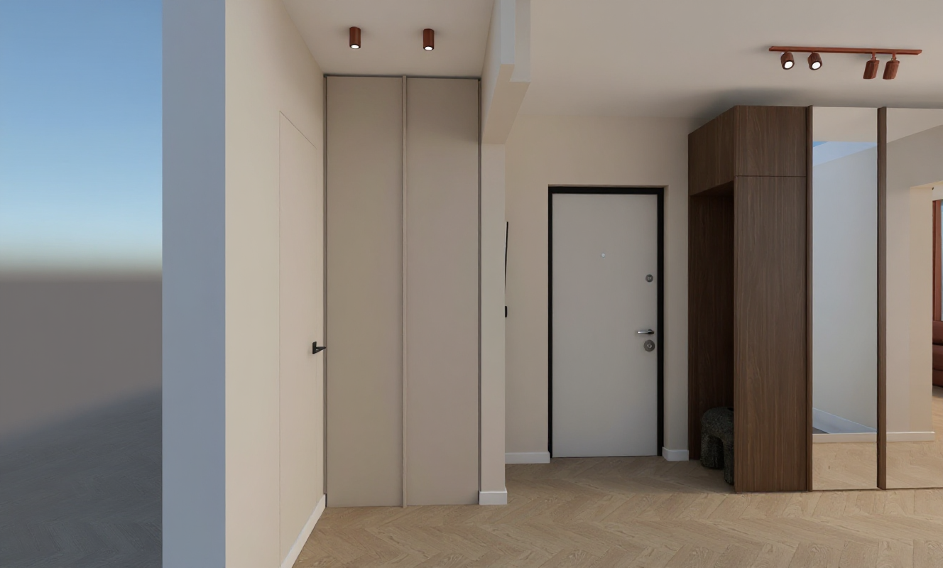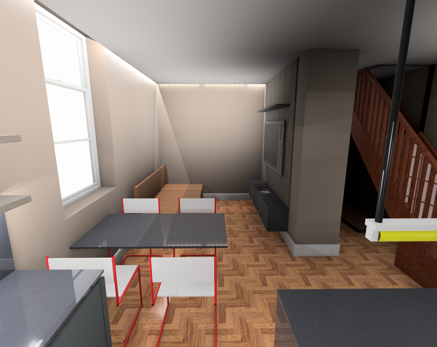 make room moody replace pc with laptop low daylight but enchance mood lighting enchance colours replace furtniture with modern furniture add some modern pictures on walls staircase to be oak with glass insert exterior doors to lookout onto brick walled courtyard and to be crittal styled
