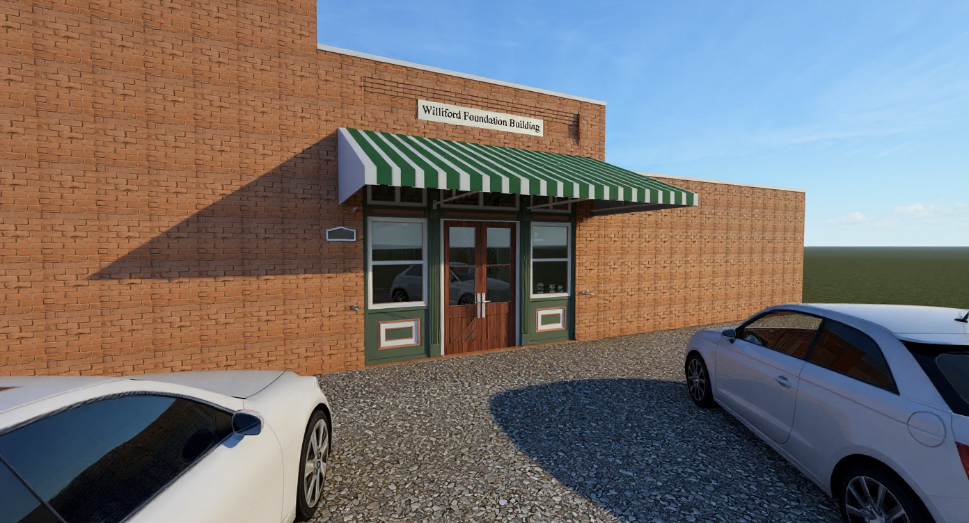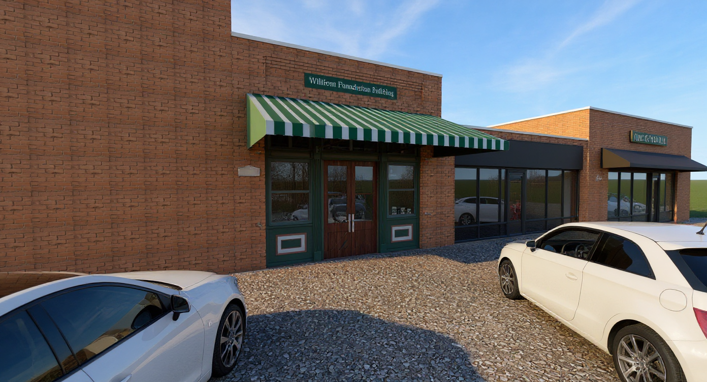 bar facade lit up at night surrounded by lush plants and ungulfed in fog
