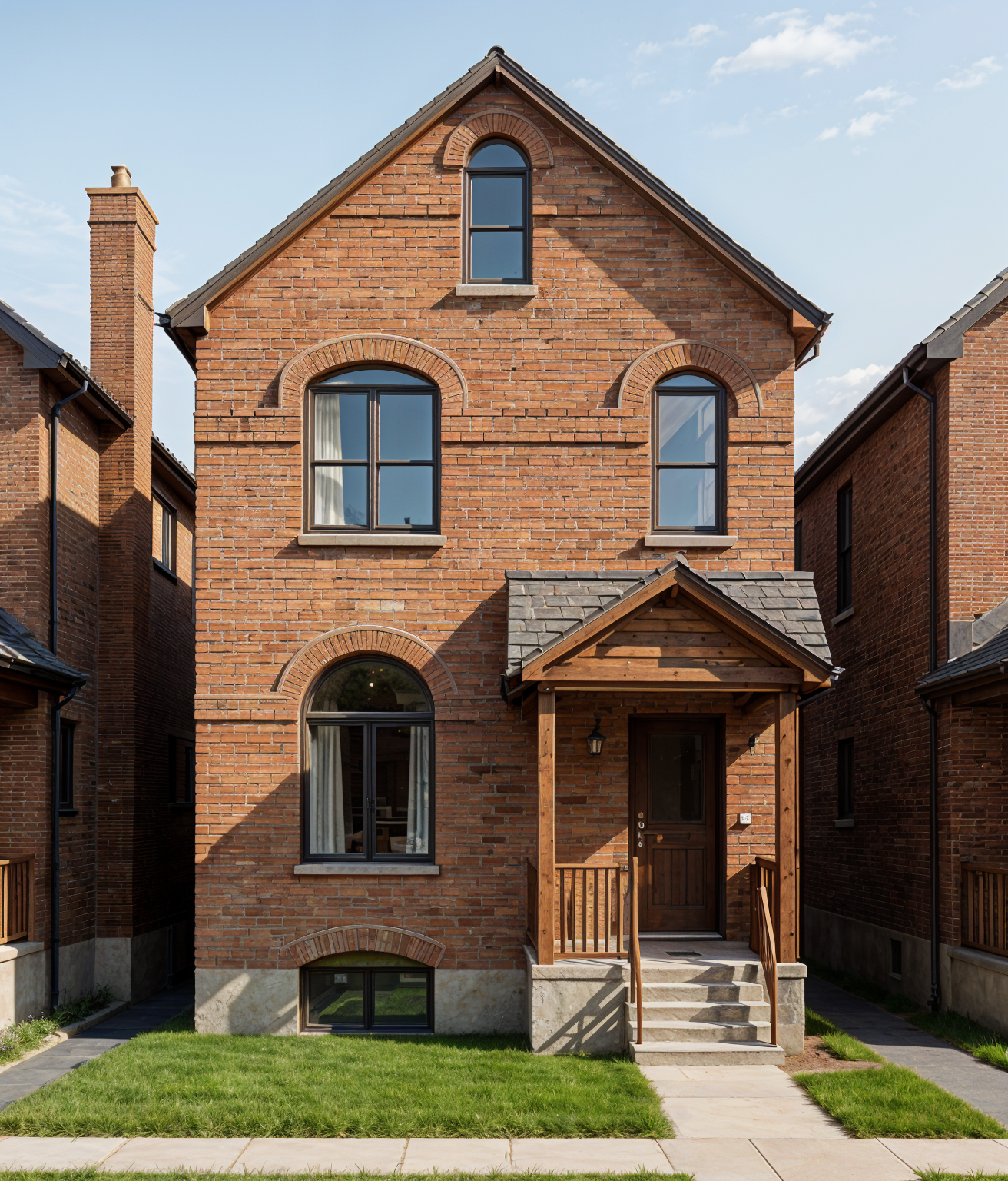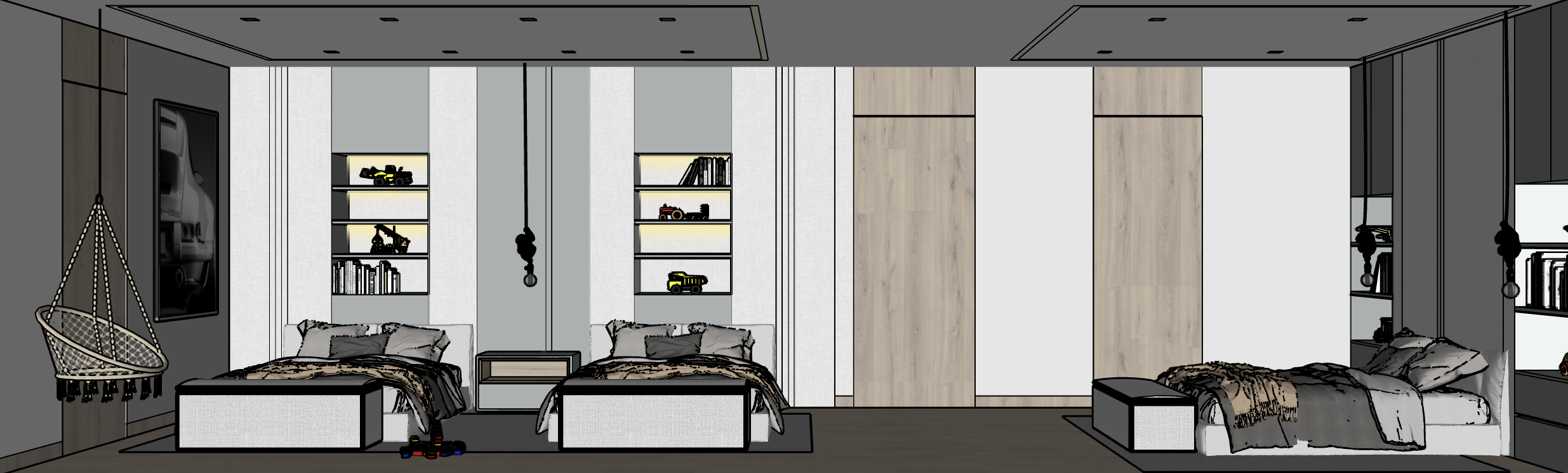 render a contemporary children s bedroom with a warm and minimalistic aesthetic the room features three single beds with light gray upholstered frames and layered bedding in soft gray and beige tones accented with textured throws behind the beds built in shelving units are integrated into the wall softly backlit and decorated with books toys and decorative objects in muted colors the wardrobe doors are finished in natural light oak wood paired with sleek white panels for a modern contrast a hanging rope chair with woven detailing adds a playful touch near the left wall the flooring is a dark matte wood complementing the soft neutral color palette of whites grays and natural wood the ceiling is recessed with modern spotlights and minimalist black pendant lights hang above the bedside area creating a cozy yet sophisticated atmosphere the overall ambiance should feel warm inviting and softly illuminated with an emphasis on natural materials and modern lines