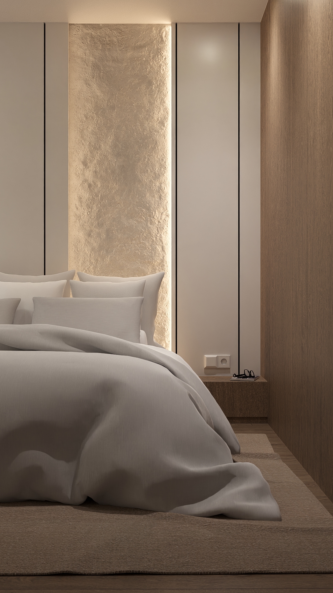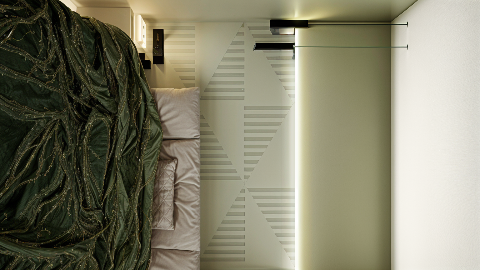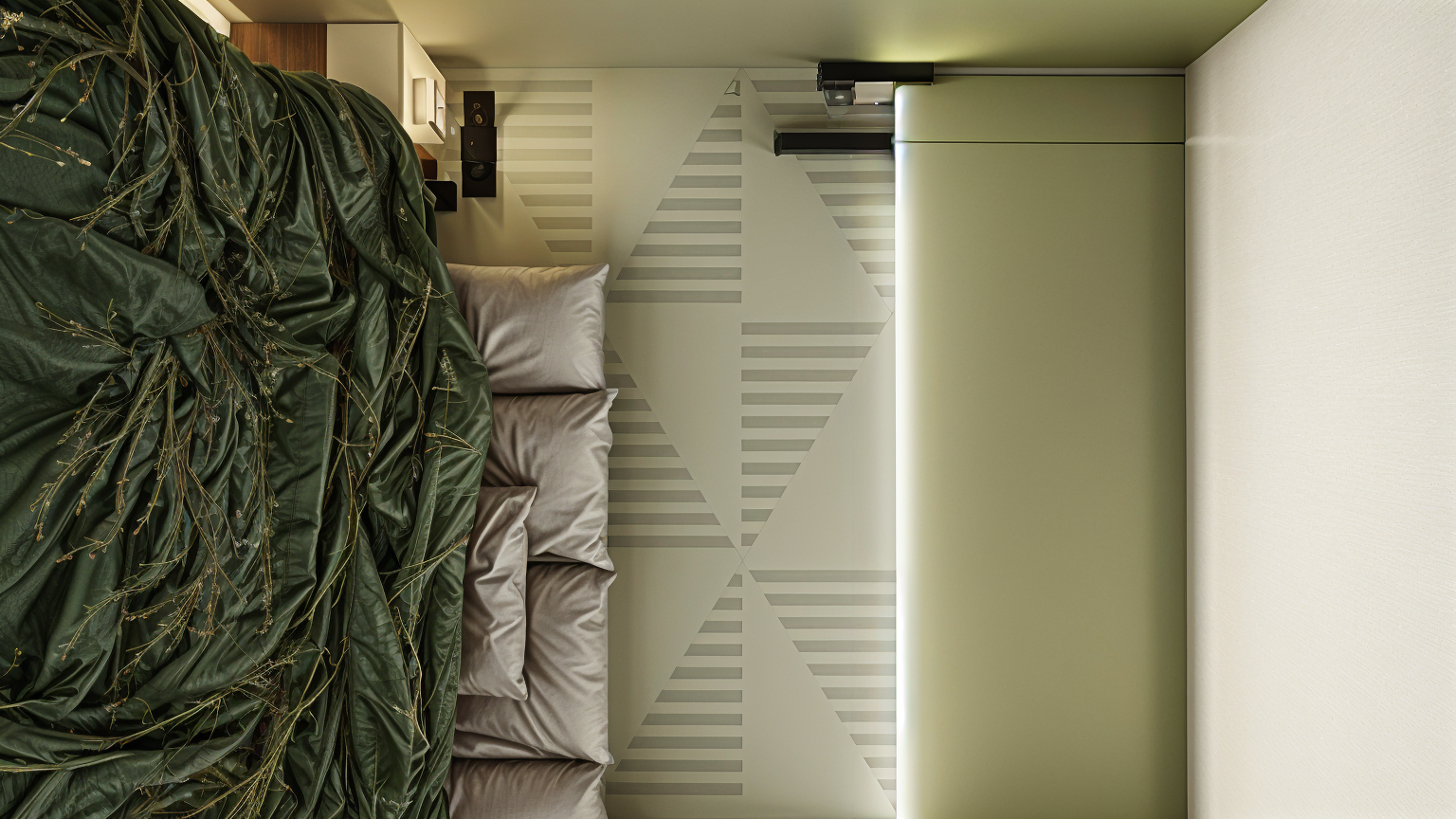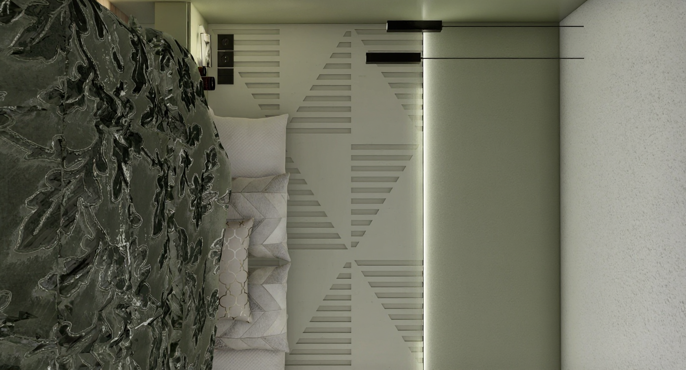 art deco interior shot render a modern bedroom with a minimalist design use a soft olive green for the walls paired with a crisp white ceiling include a textured headboard with geometric patterning in a slightly darker shade of green place black pendant lights hanging from the ceiling on either side add a bed covered with a green floral patterned blanket accented by white and light grey pillows with subtle patterns ensure the atmosphere is serene and soothing with soft ambient lighting architecture