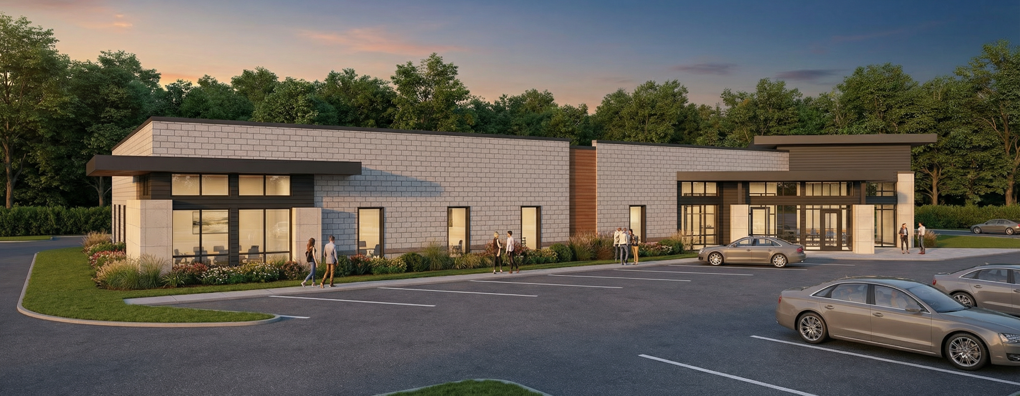 render this modern mixed use building in a residential neighborhood with stucco and black trim with black standing seam metal roofs