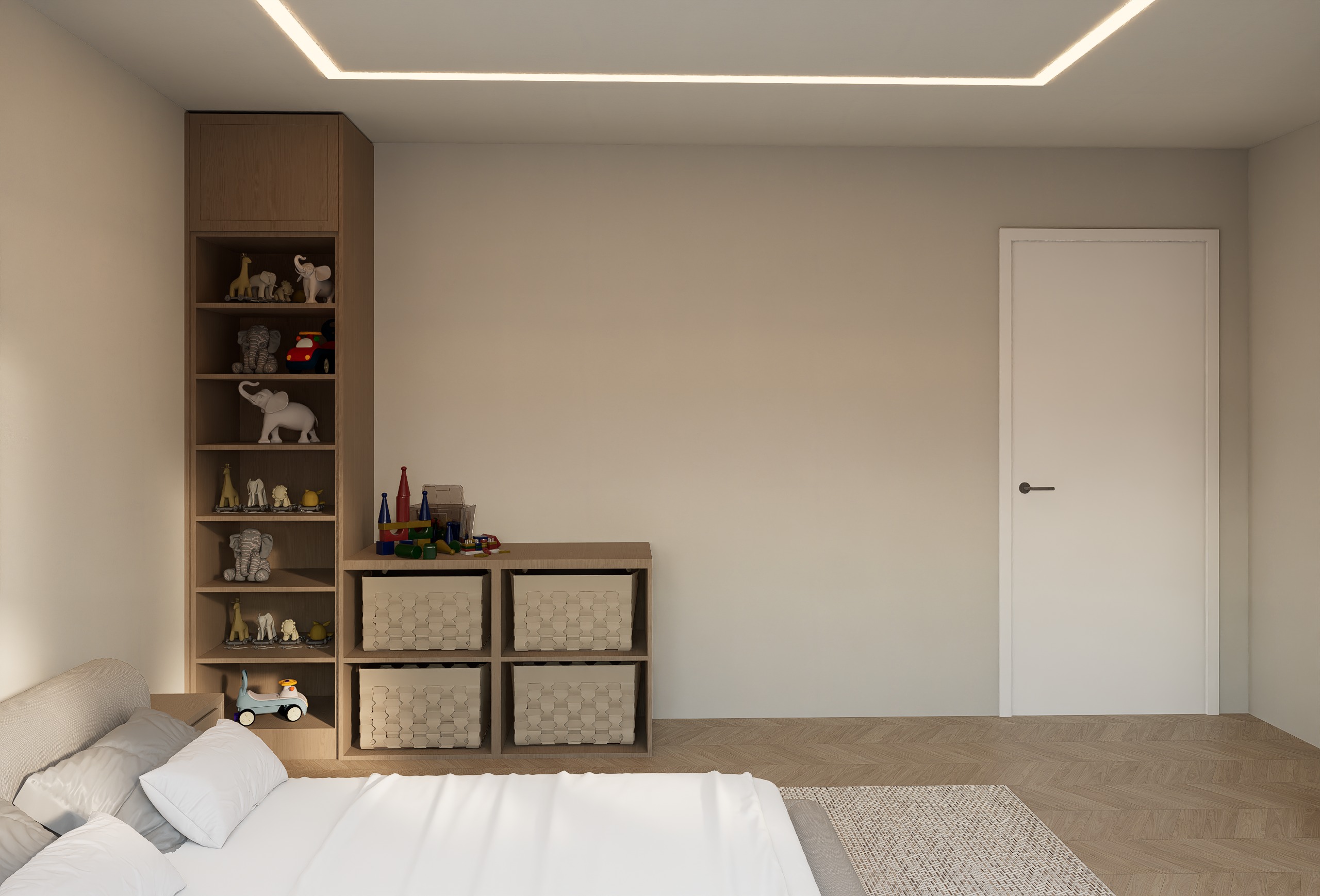 transform this bedroom interior into a high end professional architectural render with a clean realistic premium look keep the exact same design layout proportions built in furniture shelving door position bed position ceiling lighting detail camera angle and composition do not change anything in the design no redesign no moving objects no changing materials no restyling enhance the render quality and realism while preserving the minimal aesthetic make all materials look professionally rendered and believable bed upholstery and bedding should have realistic fabric texture soft folds natural wrinkles subtle stitching and proper thickness wood cabinetry shelving side table and storage unit should read as real natural wood veneer with fine grain soft tonal variation accurate matte finish and premium detailing woven baskets should have realistic texture depth and shadowing flooring should look like authentic wood parquet with refined grain natural variation and clean high end finish walls and ceiling should remain smooth and minimal but with subtle realistic surface response door and handle should look crisp realistic and properly lit toys and decorative objects should stay exactly where they are but with more believable material definition and detail lighting should remain soft and elegant but more realistic improve the led ceiling strip lighting so it glows naturally and evenly keep the room bright and balanced with realistic indirect light add subtle contact shadows and ambient occlusion for depth maintain a calm warm neutral luxury residential mood balanced exposure realistic contrast no overexposure final image should feel like a professional interior design visualization clean warm minimal and polished strictly preserve the existing design and composition 1 1 only improve realism material fidelity lighting accuracy and render quality