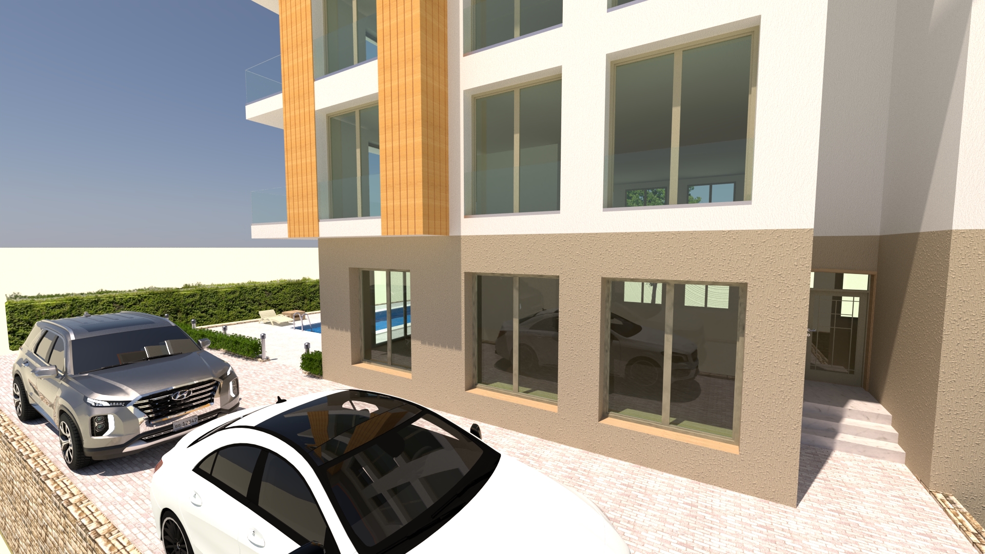 exterior shot landscaping around the hause more reflection on glass surfaces realistic wood mink color window frames buildings around the hause pool at the backyard architecture