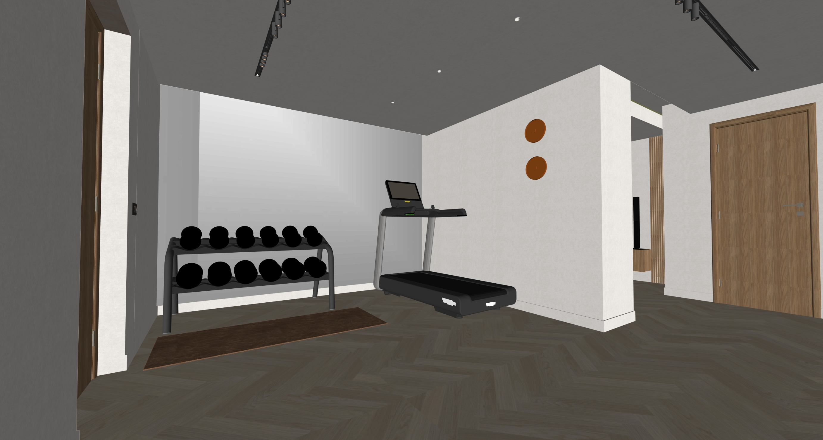 keep exactly the same geometry make materials more realistic make lighting more realistic all walls and ceiling have beige texture add lighting to the lights of the ceiling add a man running on the treadmill the bottom wall is covered all with mirror add lighting coming from the lighting wall fixtures behind the treandmill