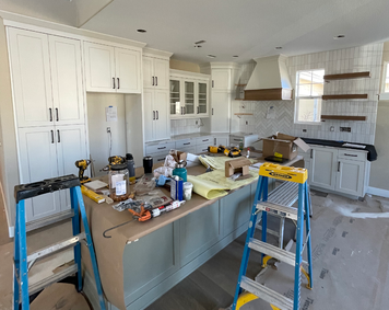 do not change the cabinets in any way preserve the exact cabinet colors materials finishes dimensions door and drawer styles hardware spacing alignment and all geometry exactly as shown do not alter the countertop shape backsplash appliances flooring lighting fixtures or wall structure only remove the construction materials clutter and mess from the scene clean the room and make it look finished and staged add a few simple tasteful home accessories appropriate for the style of the space but do not add or remove any furniture windows or architectural elements maintain the original lighting direction and realism enhance clarity and polish the photo while keeping the cabinetry and room design completely unchanged do not alter the lighting to keep the cabinet colors as they are in the image add a slide in range below the hood