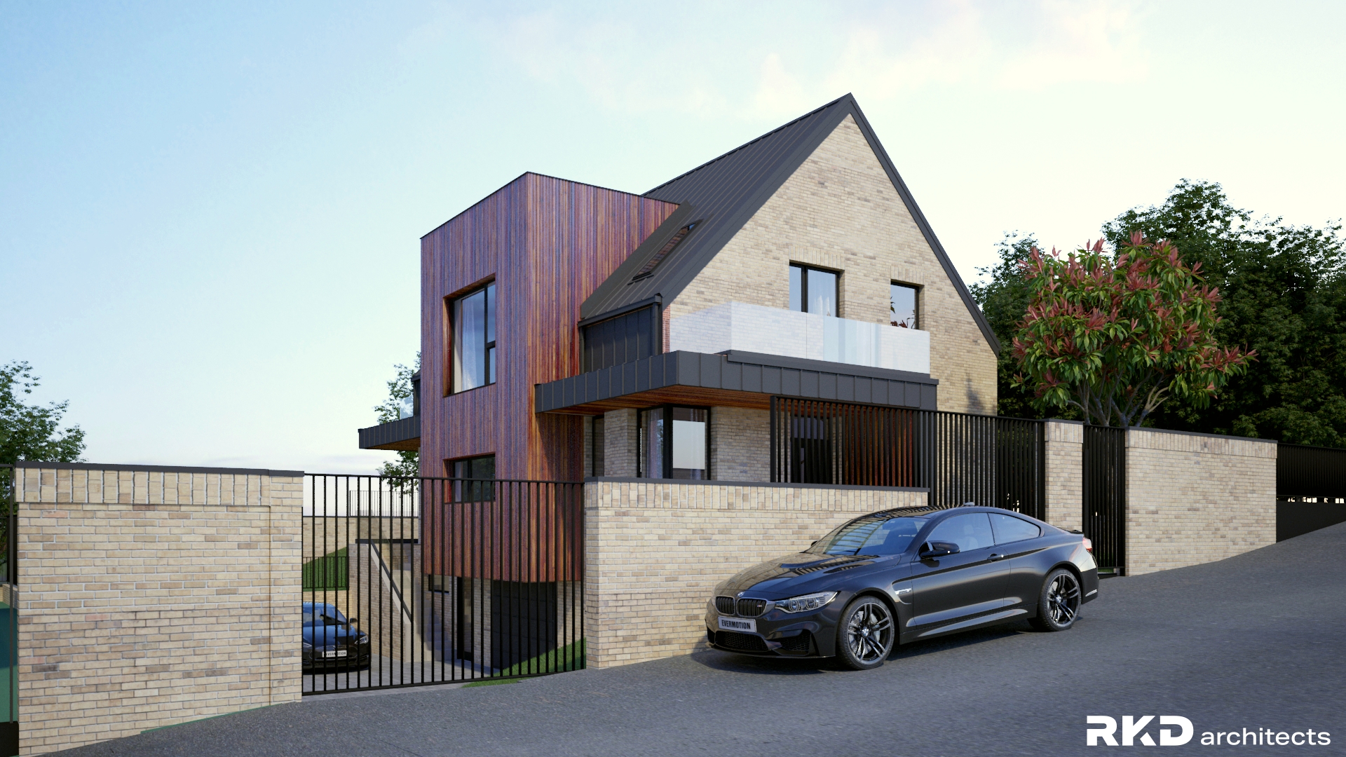 modernist exterior shot a beautifully rendered modern minimalist house set amidst a serene natural environment the house features angular wooden structures with a dark gray and black exterior large glass windows reflect the subtle hues of the surrounding landscape the wooden siding has warm earthy tones like soft browns and is combined with sleek contemporary black trimming the atmosphere is tranquil and the lighting is soft mimicking a gentle morning or late afternoon light the ground is adorned with patches of green moss and vivid yellow wildflowers adding a burst of color and life the surrounding trees are leafless drawn with delicate thin black lines indicating the late autumn season shadows of the trees create an intricate pattern on the house and the ground in varying shades of gray and brown the entire setting feels both modern and natural embracing simplicity and elegance architecture white facade keep windows from concept the background is forest please preserve the architecture and proportions of the building behind the building we have a slope and a forest