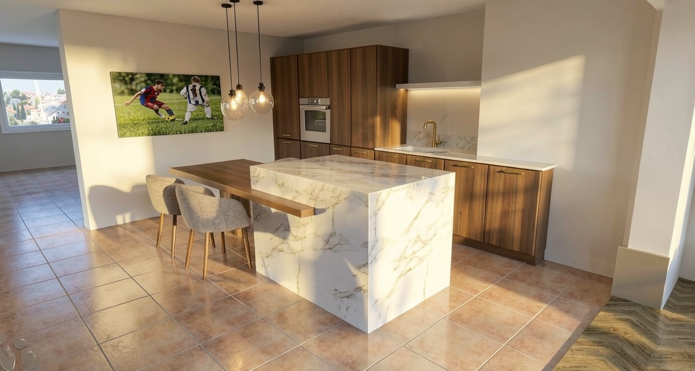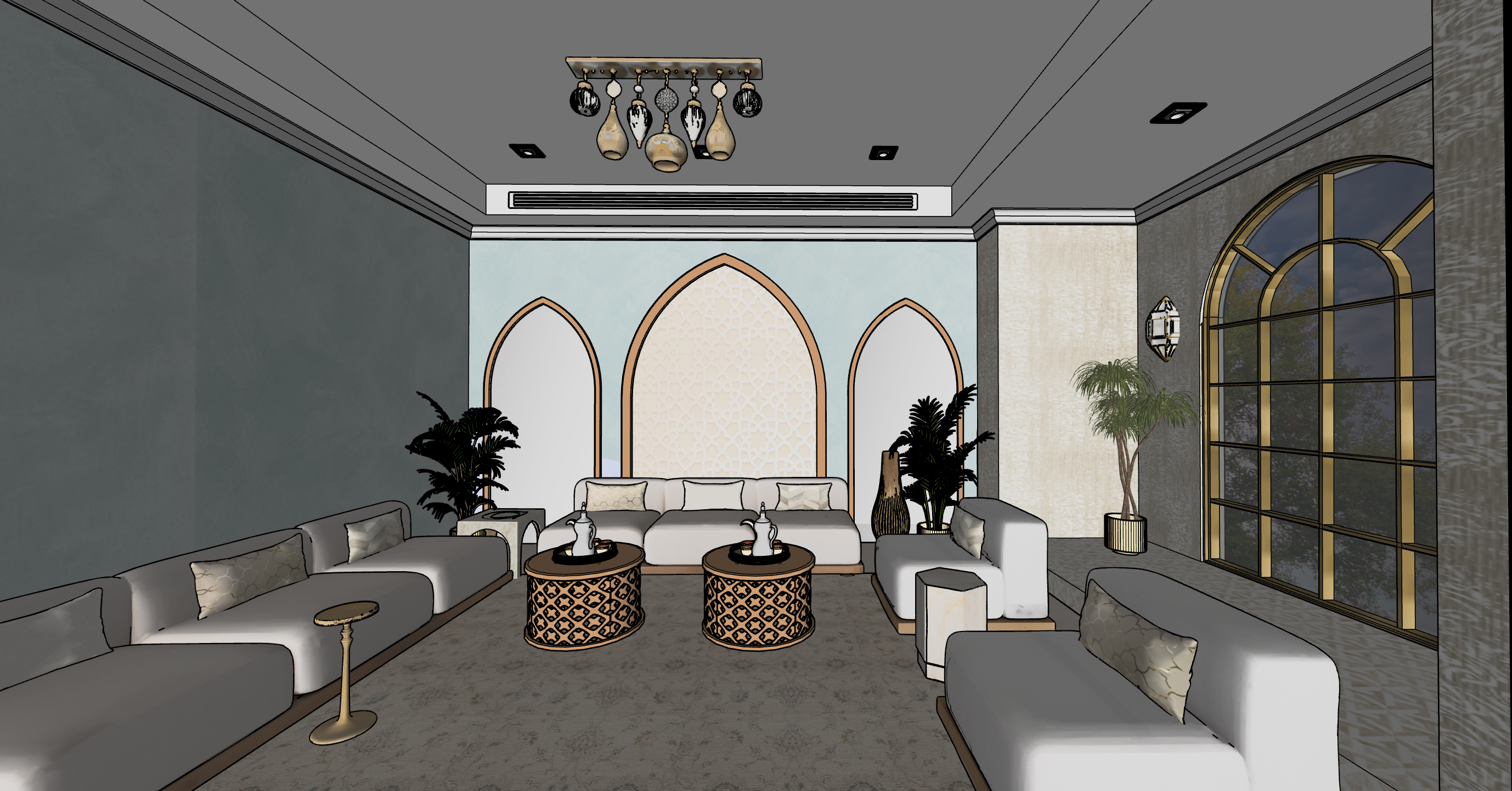 use the uploaded sketchup perspective view as the base image keep the exact camera angle perspective distortion and field of view from the original sketchup image do not change the viewpoint composition or proportions even if the perspective looks stretched transform the image into a high end architectural visualization render as if produced by a professional architecture studio lighting use soft natural daylight coming from the windows with realistic global illumination subtle shadows and balanced exposure typical of architectural photography materials upgrade all materials to realistic physically based materials pbr with correct reflections textures and subtle imperfections keep the design but make surfaces look real and premium mirrors add elegant architectural mirrors on the walls to enhance depth and light reflection the mirrors should feel integrated with the interior design and reflect the space naturally chandelier replace the existing chandelier with the attached for a luxury interior the fixture should feel like a designer piece often used in high end architecture projects rendering style photorealistic architectural visualization similar to renders produced by top architecture firms clean composition realistic lighting natural material response and refined atmosphere camera wide interior architectural photography lens approx 20 24mm equivalent maintaining the original sketchup perspective quality ultra detailed high dynamic range realistic reflections realistic indirect lighting high resolution professional archviz render