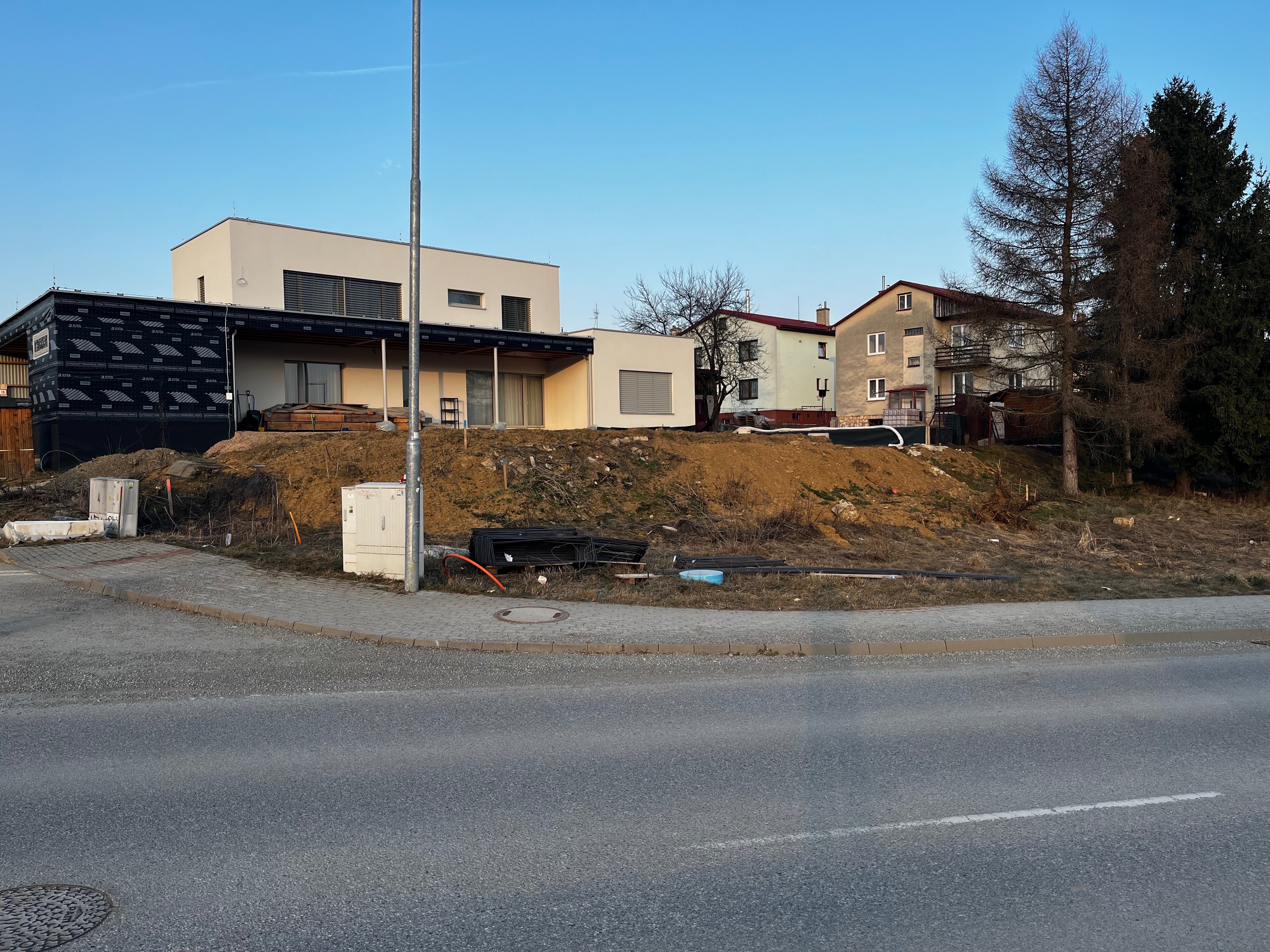 add a reinforced concrete retaining wall below the house on the slope following the natural terrain the wall should look structurally realistic with clean modern concrete finish light gray slightly textured on top of the retaining wall add a visually appealing fence modern design e g horizontal metal slats or a combination of metal and wood make sure the wall integrates naturally into the hillside and connects logically with the house surroundings keep proportions realistic and consistent with the scale of the house preserve the original house design and environment only enhance the lower terrain area with the retaining wall and fence photorealistic style natural lighting high detail
