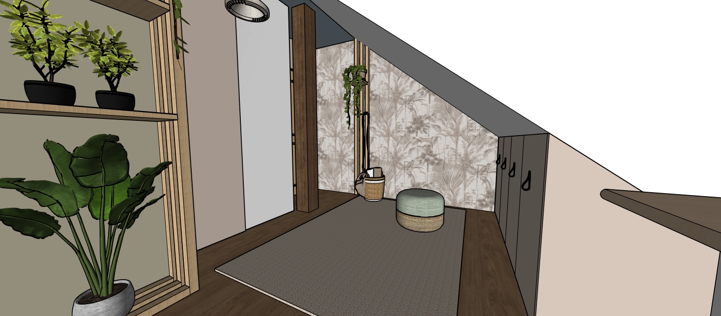 attic relaxation room in a family house multifunctional space for rest yoga and occasional sleeping sloped ceiling attic interior oak wood floor vertical wooden slats integrated shelves with indoor plants minimal furniture photoreal render wallpaper on back wall calm and cozy atmosphere scandinavian japandi style wide angle interior shot eye level camera architectural photography ultra realistic architectural render high detail natural materials 8k no people no clutter no messy objects no distortion no fisheye lens no unrealistic proportions no warped walls no cartoon style no cgi look no low resolution no blurry textures zen atmosphere soft shadows peaceful mood photorealistic render