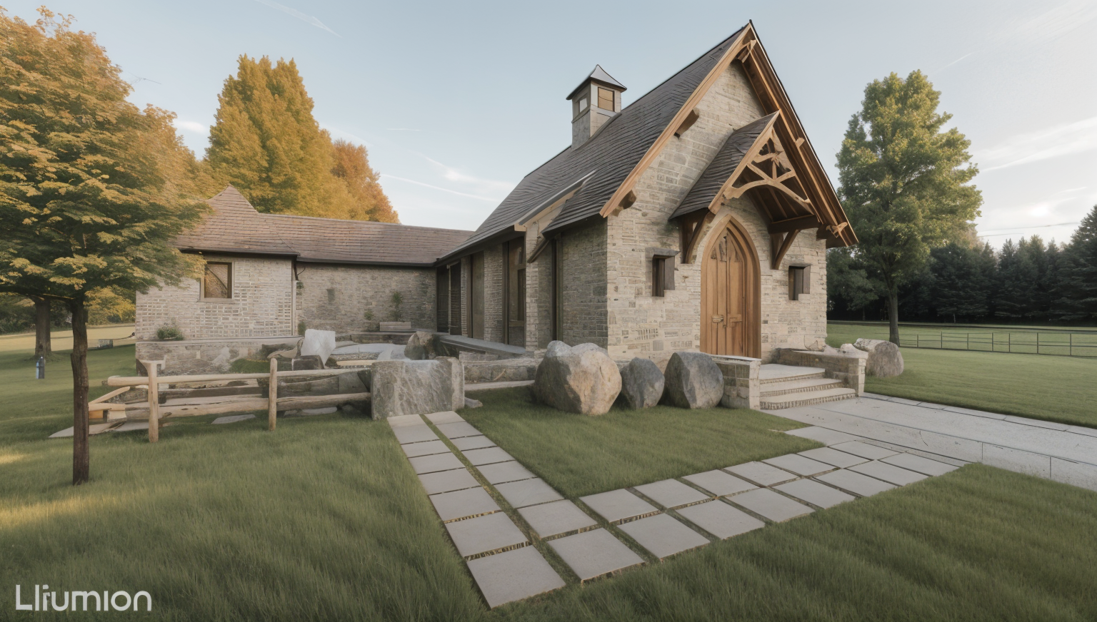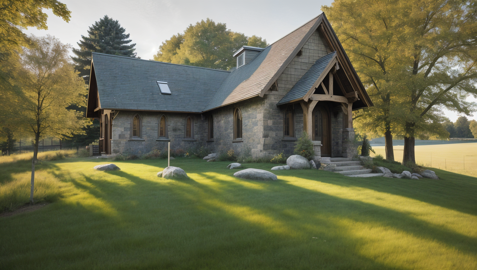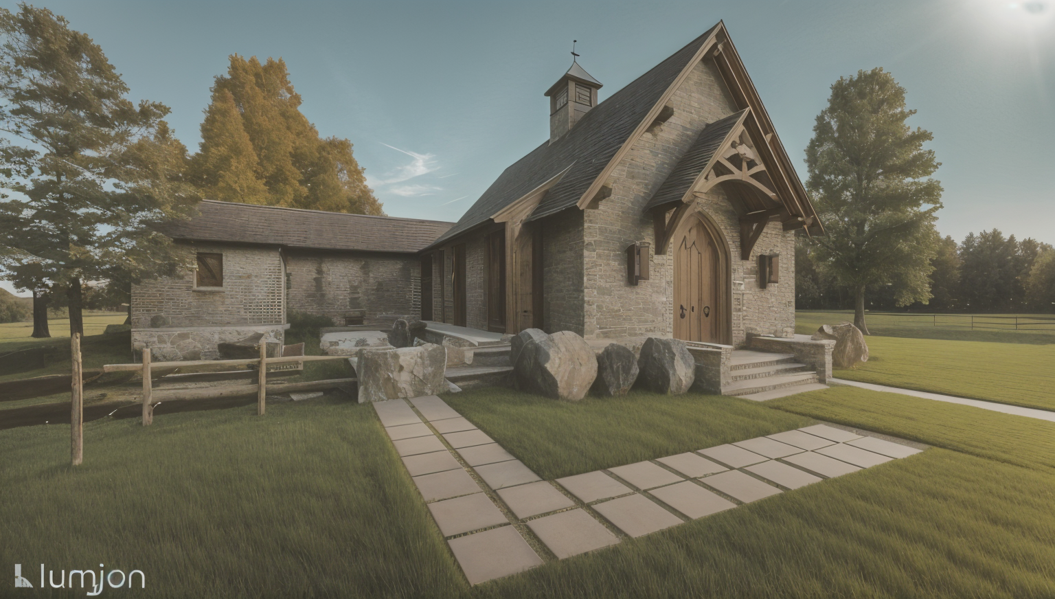 exterior shot a rustic chapel with stone siding ang green grass and bushes architecture