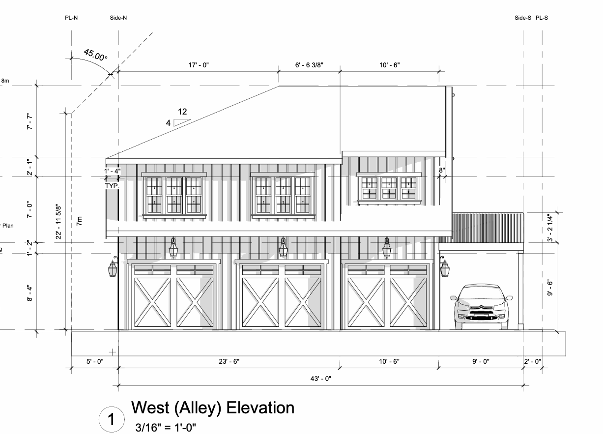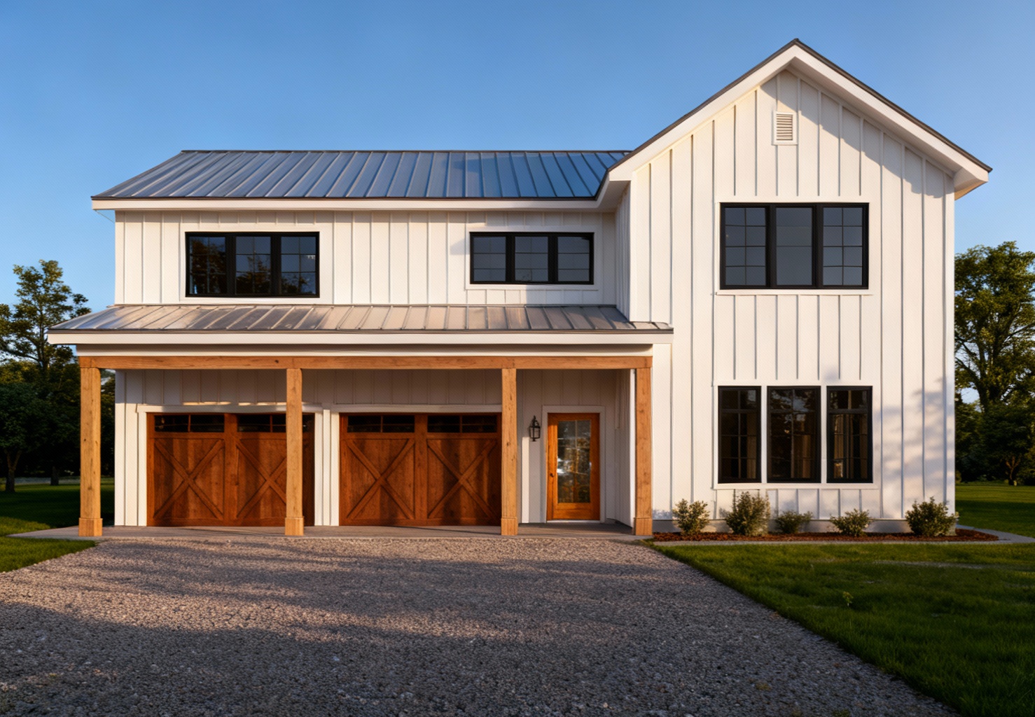 modern farmhouse exterior white board and batten siding natural wood porch posts black modern windows and wood brown garage doors with farmhouse crossbuck detailing metal roof clean trim and a warm wood door with glass insert lighting soft late afternoon light blue sky gentle shadows realistic textures and high quality materials simple landscaping green lawn minimal shrubs a few background trees and a clean gravel driveway render at high resolution straight on or slight 3 4 view 3 dimensional look final result visually match the reference style colour palette and overall mood while keeping the exact form and roof lines