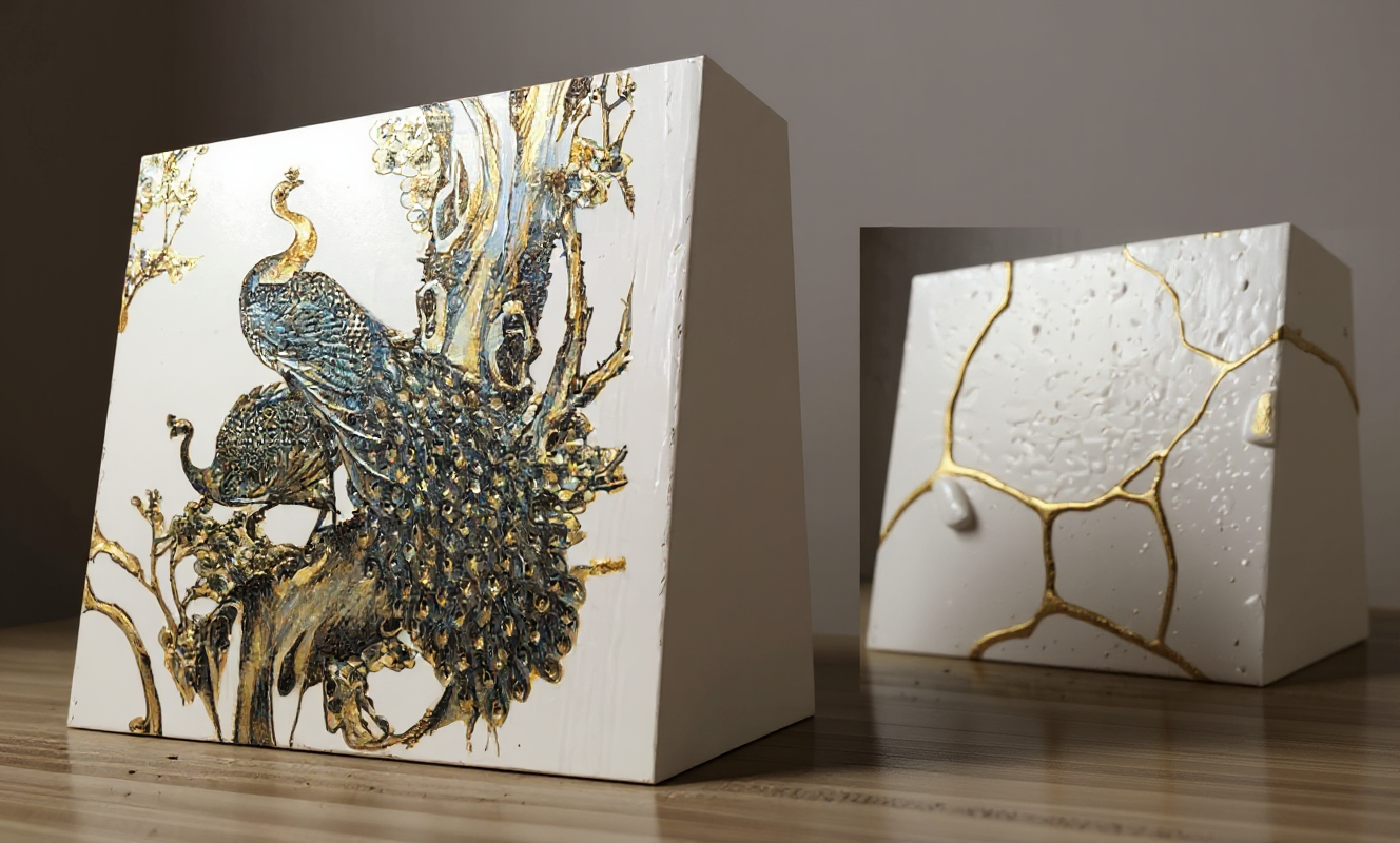 render the image on the left with adding some gold kintsugi paint effect to it however maintain the blue and white scene as it is