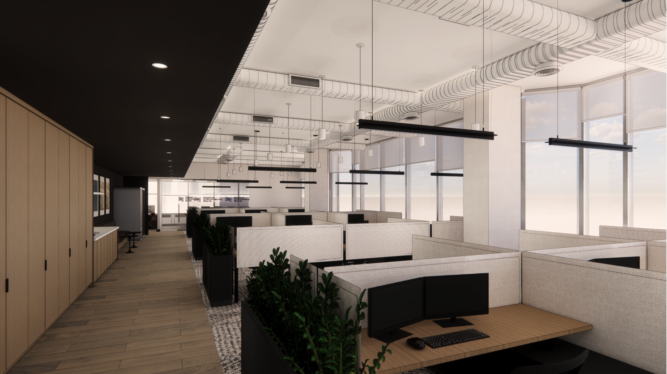 enhance this existing office rendering for leasing and marketing purposes without changing the architecture layout materials furniture lighting design ceiling elements millwork workstation configuration window treatments or overall aesthetic of the space preserve the current design exactly as shown add a subtle layer of realism and life by inserting a small group of young professional office workers throughout the space include a mix of caucasian and mixed race professionals in their 20s to 30s dressed in modern business casual attire show natural workplace activity such as focused individual work at desks light collaboration movement through the space and quiet conversation the people should feel candid polished and believable not staged maintain the clean elevated contemporary feel of the rendering the added people should help communicate that the environment supports innovation productivity culture and day to day team interaction keep the scene bright professional and aspirational for prospective tenants do not alter the interior design furniture selection finishes space planning camera angle perspective or composition do not add branding signage or new architectural features the goal is to enhance the rendering with human activity only while preserving the original design intent
