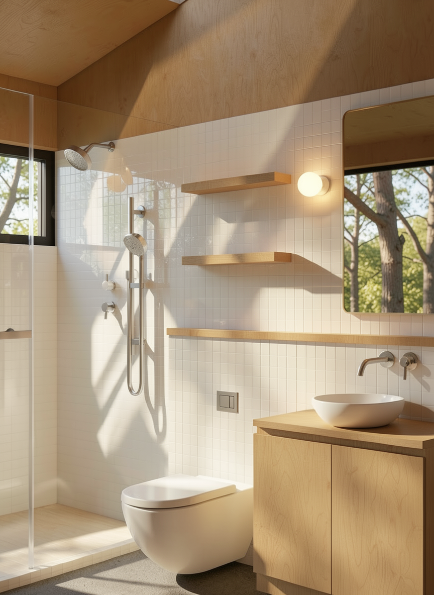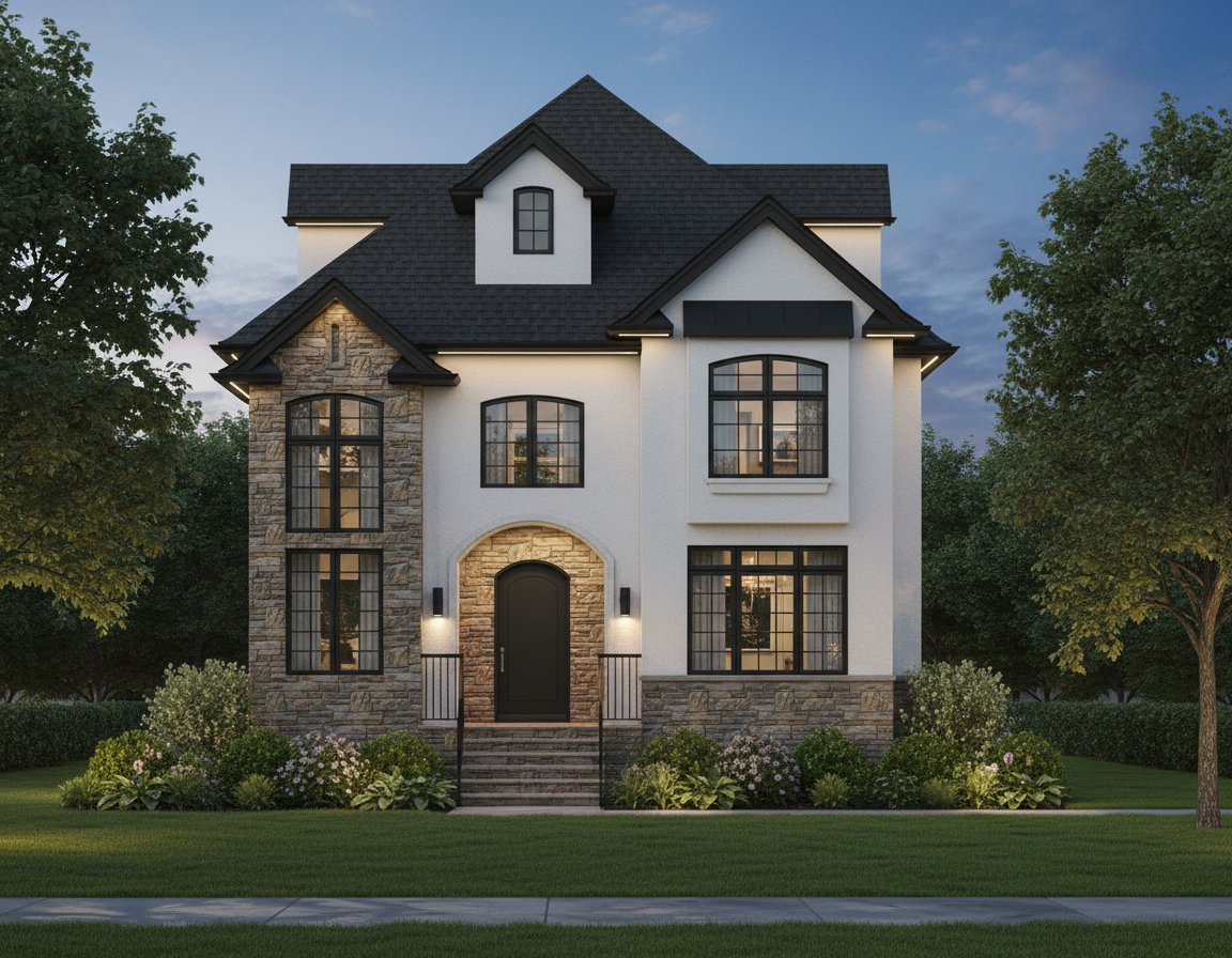 render realistic using white stucco with mixed brown color stone and black windows black accents black doors and black roofs set this is a residential neighborhood with large mature trees and very upscale landscaping provide shrubs and landscaping around the base of the house make the surround of the front door black and make the time of day dusk with lights add outdoor lighting next to front door and lighting in the soffits add a driveway going to the side yard on the right side
