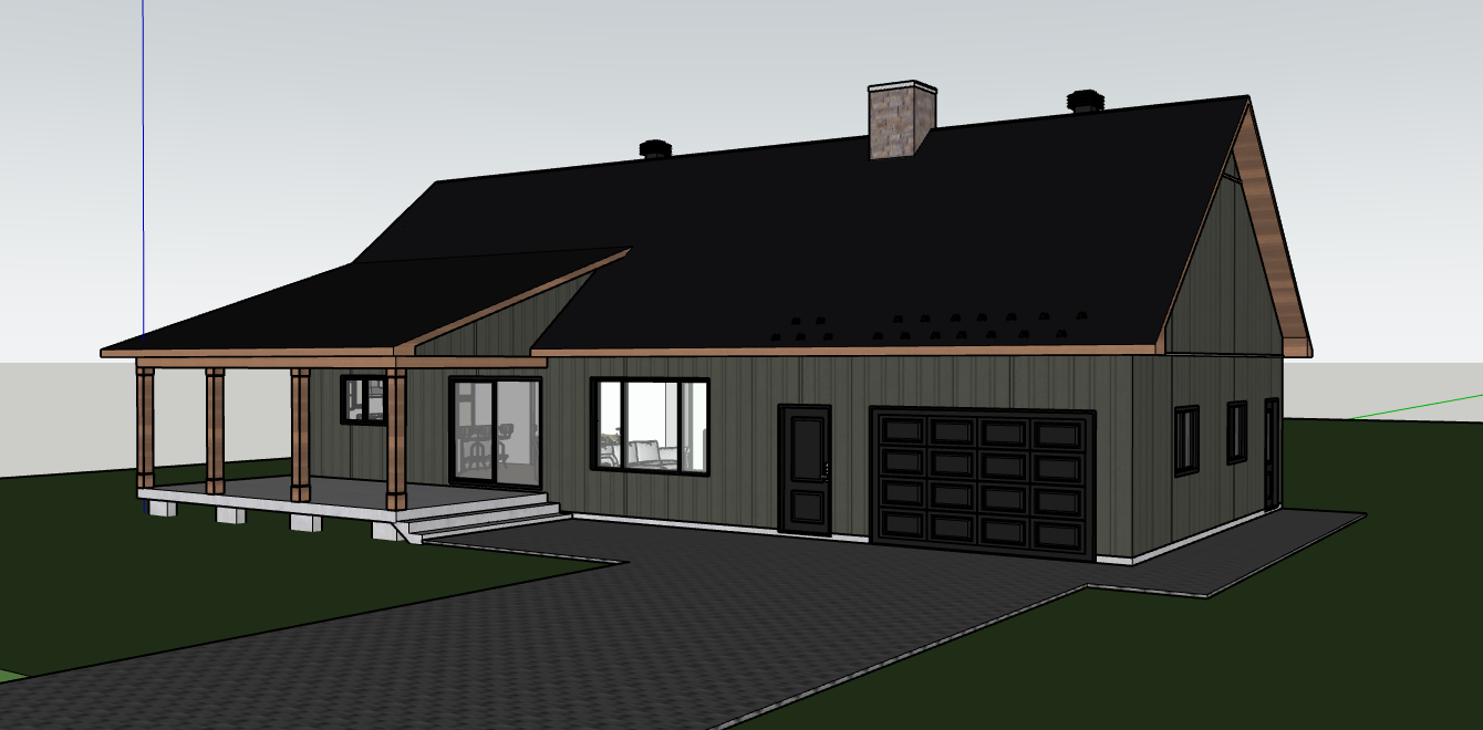 residential iron ore board and batten vinyl imperial black sheet metal roofing be on stone on the chimney soffit and finished wood fascia