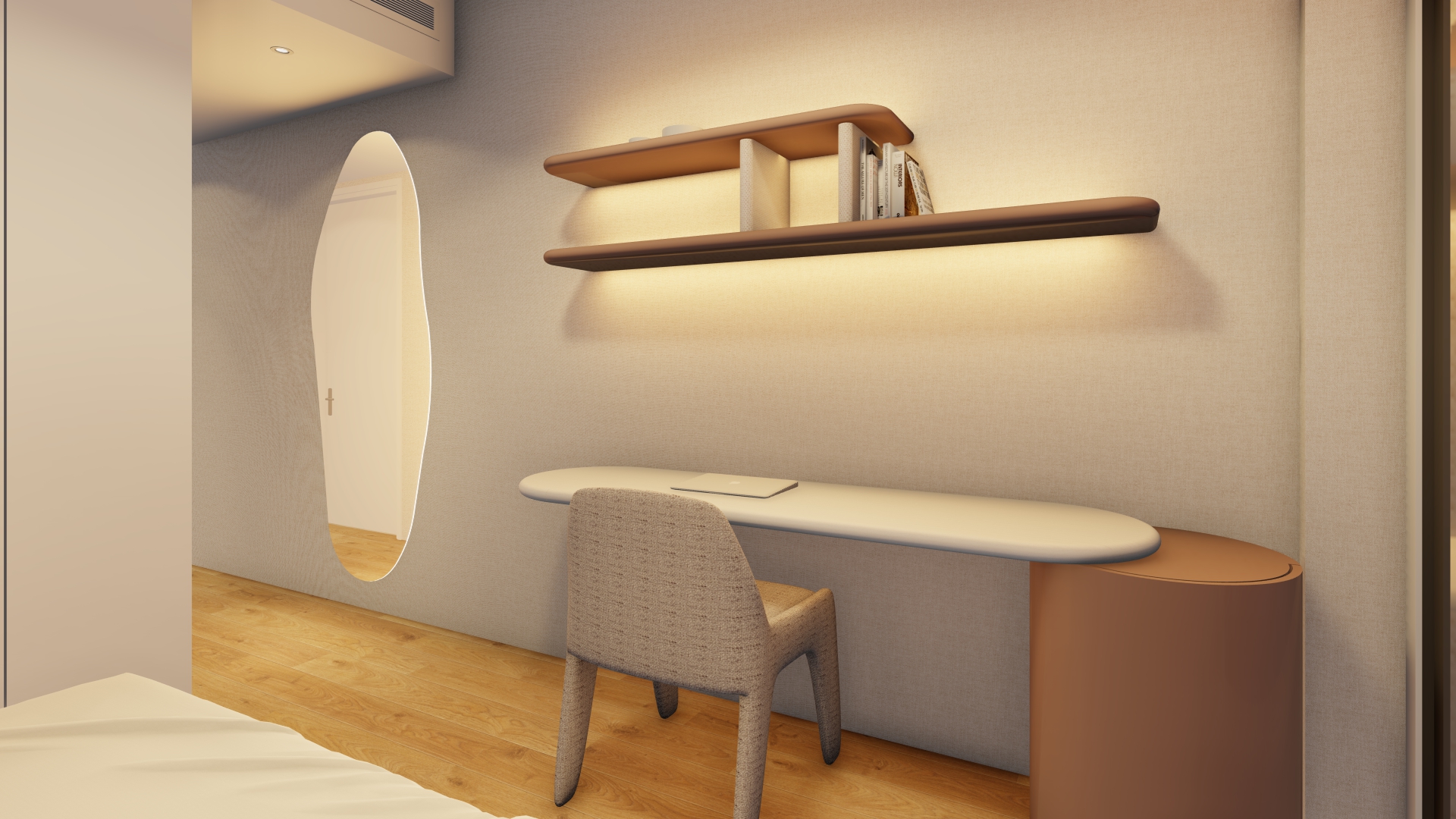 render this image in a realistic style maintaining the exact same composition furnishings lightning and design without adding or removing elements the desck is made of white colored wood