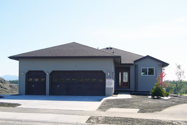 watercolor render of the image include trees and an alaska like environment in the background simple driveway and walkways in front of the home