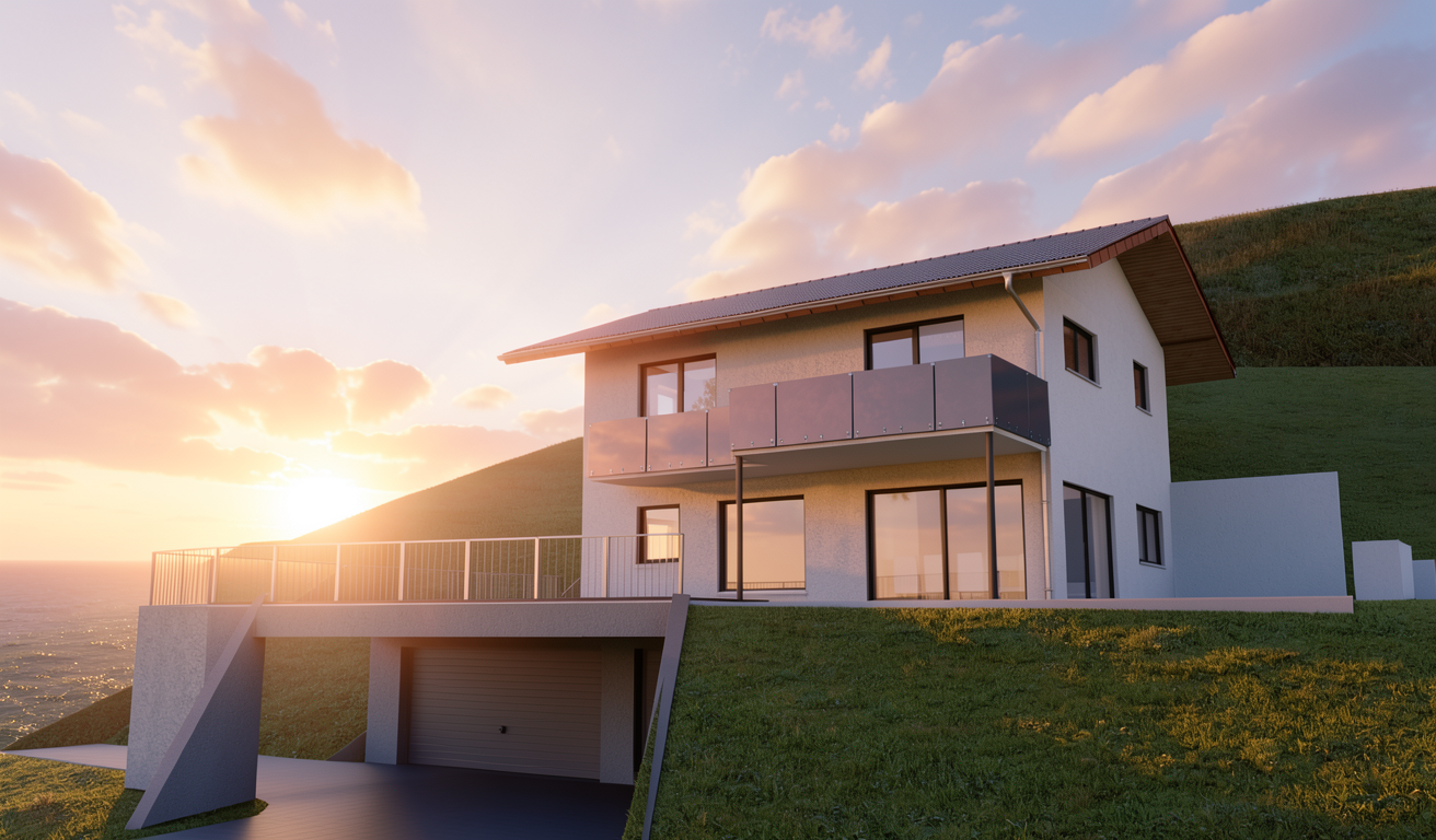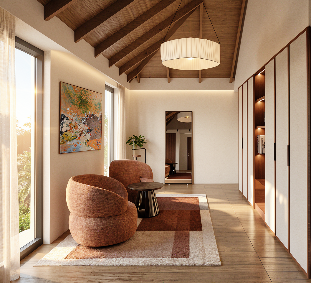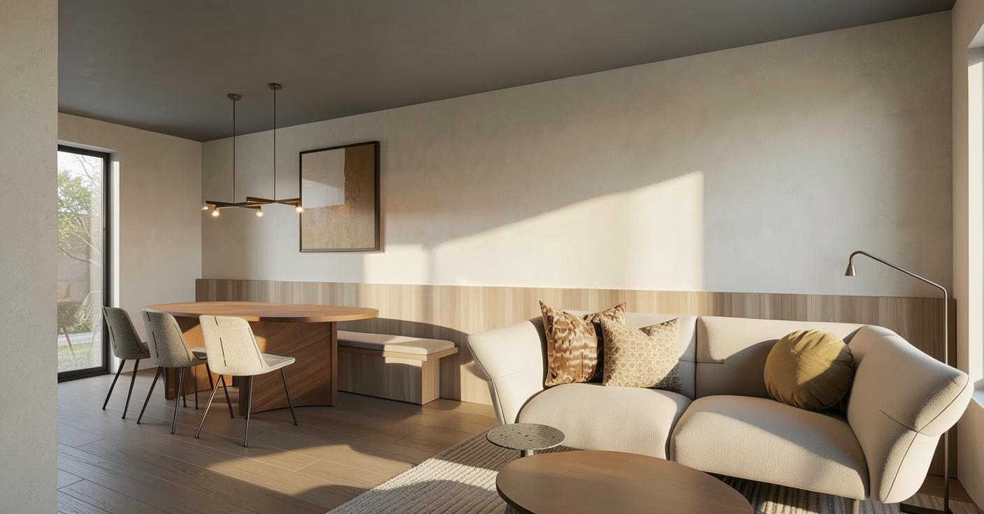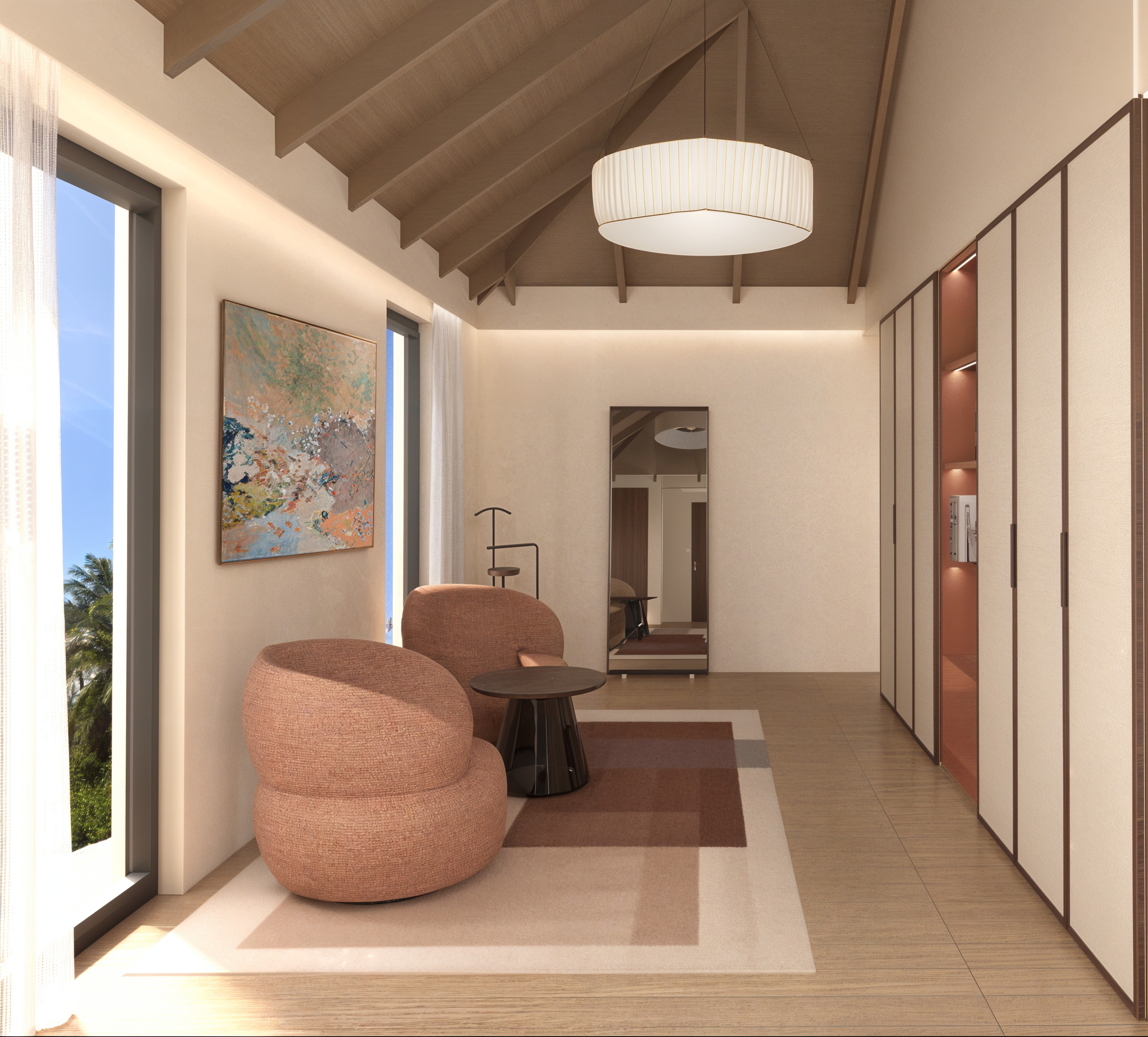 enhance this render into a soft photorealistic coastal scene while preserving all architectural details materials furniture placement camera angle and composition exactly as shown do not change the design layout landscaping or colors reduce the contrast slightly and create an airy summery mood gentle shadows warm highlights enhance realism textures reflections wood stone glass and water while keeping the original palette light warm and neutral