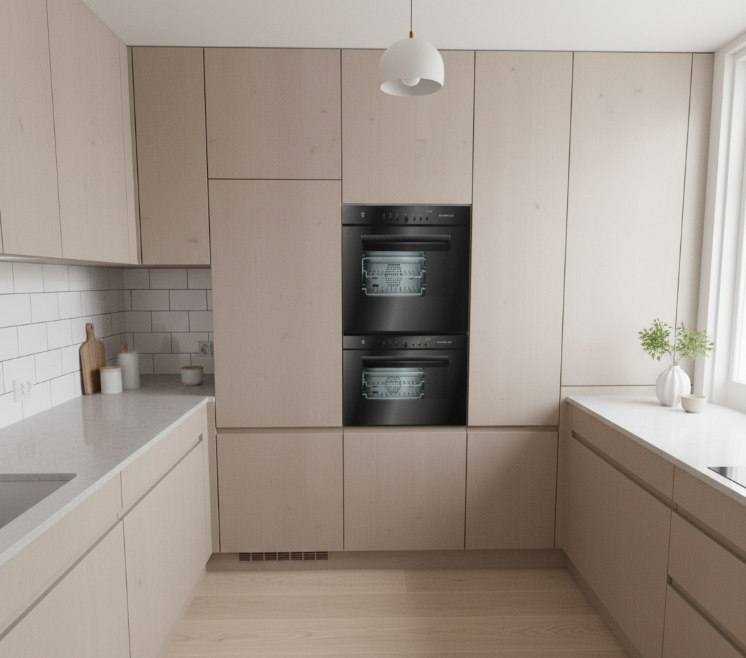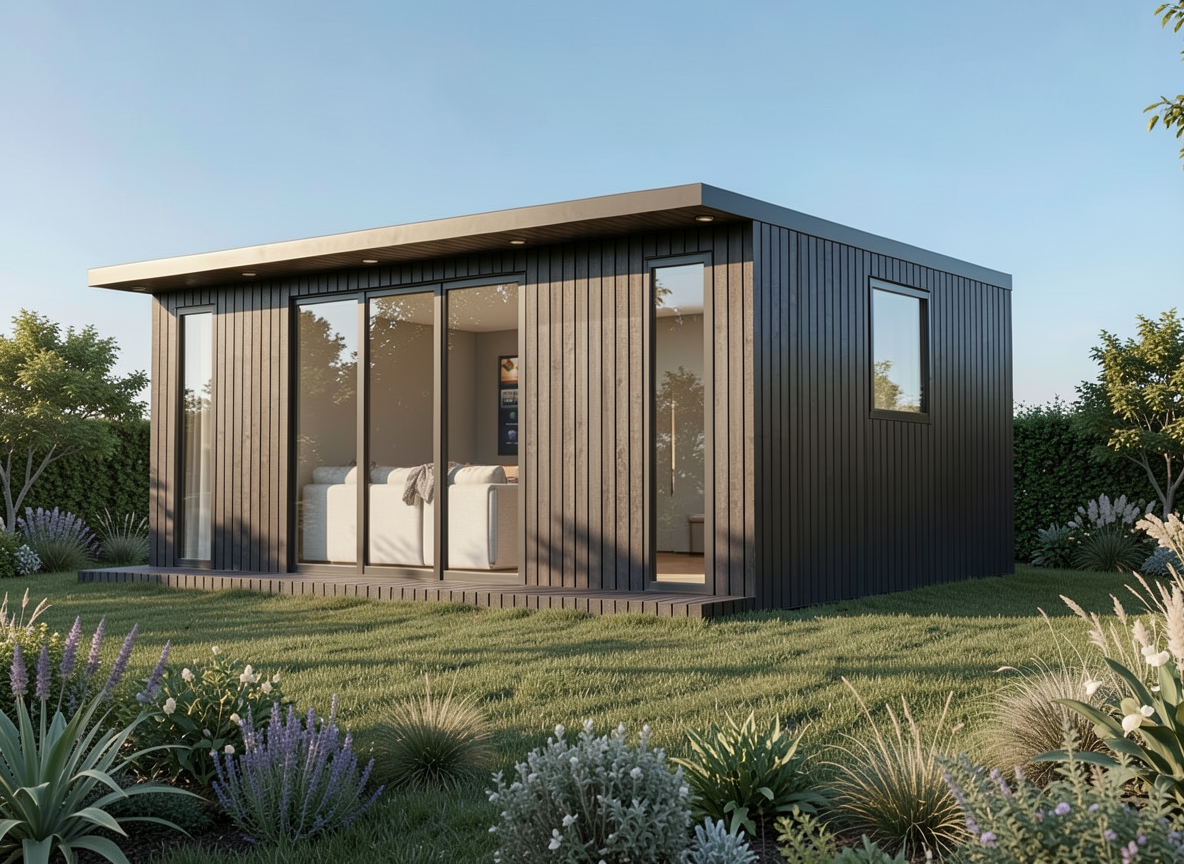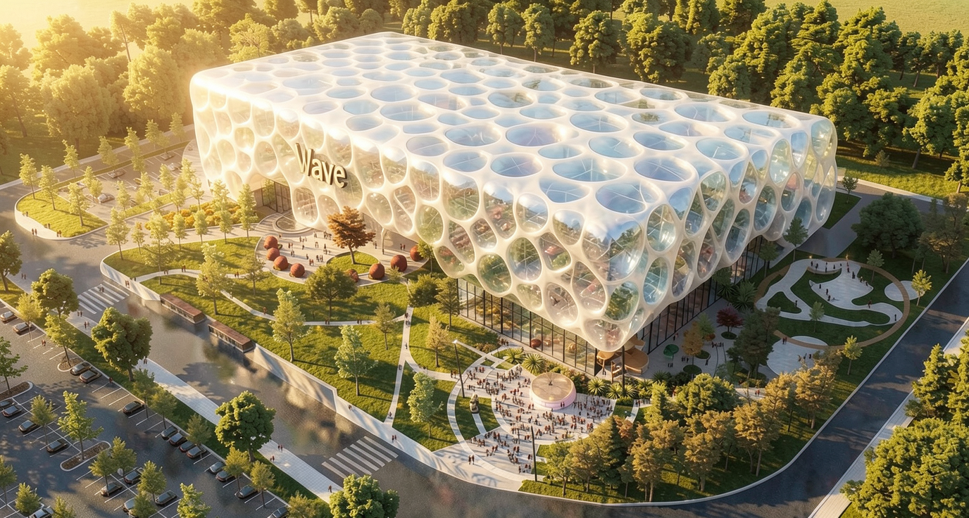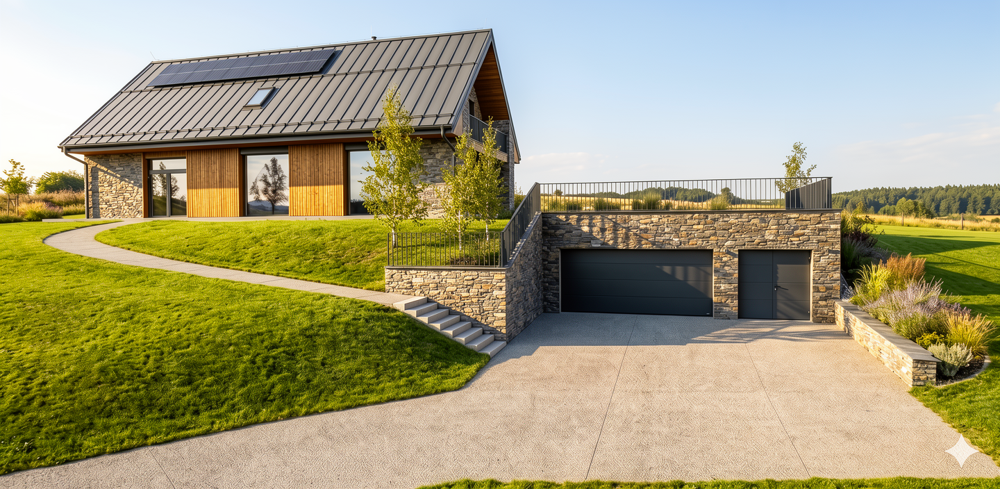 enhance this render into a soft photorealistic coastal scene while preserving all architectural details materials furniture placement camera angle and composition exactly as shown do not change the design layout landscaping or colors reduce the contrast slightly and create an airy summery mood gentle shadows warm highlights enhance realism textures reflections wood stone glass and water while keeping the original palette light warm and neutral