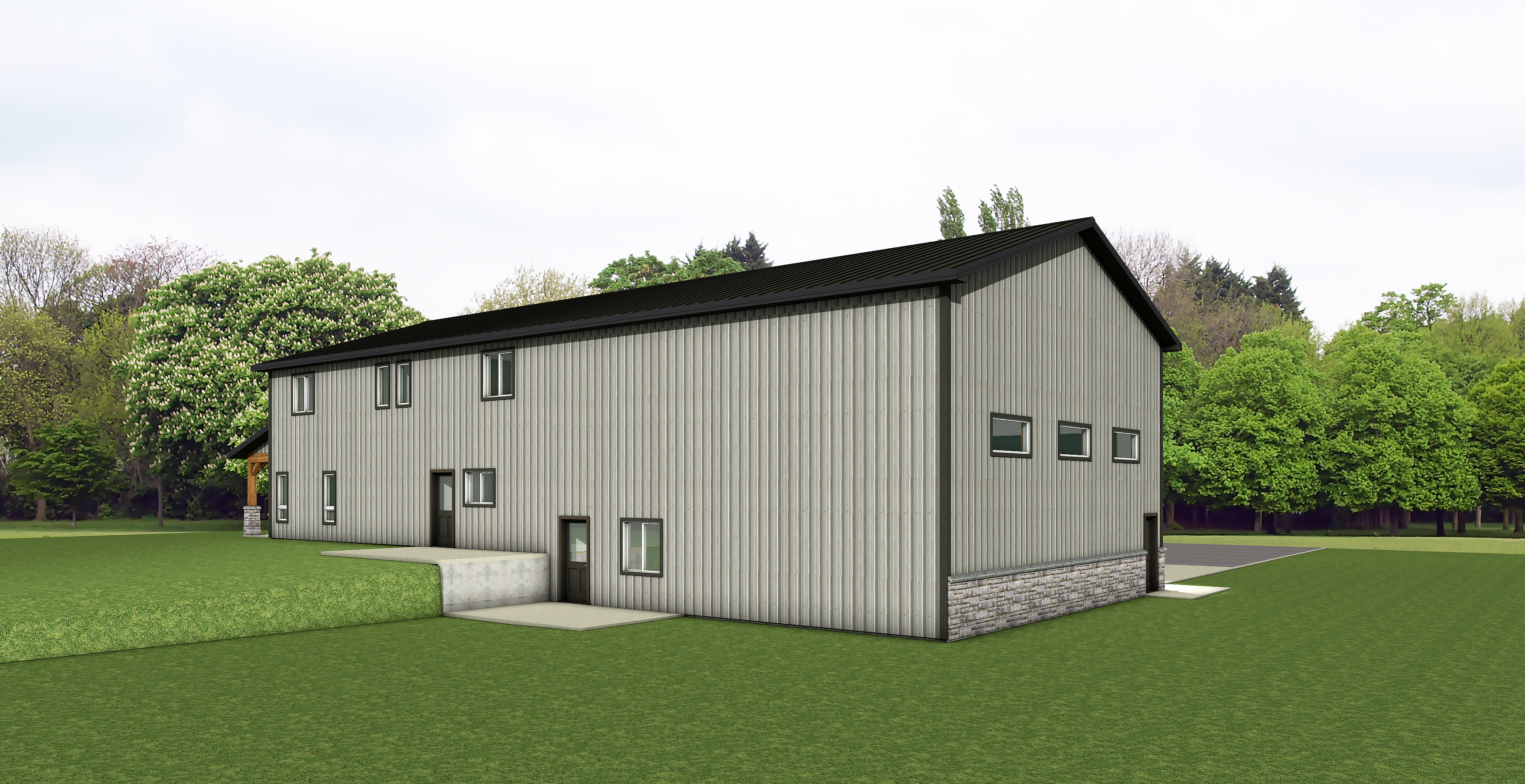 a modern two story barndominium farmhouse with light gray vertical metal siding black standing seam metal roofing exposed wooden timber posts supporting the covered patio retain the exact structure and window arrangement patio columns rooflines foundation height and proportions exactly as shown in the reference image integrate into the terrain surround the property with a lush dense forest of tall mixed evergreens and hardwoods add warm golden sunlight subtle dappled highlights across the siding and grass create ultra realistic lighting crisp shadows detailed textures in the siding and glass reflections and a vibrant clear sky with light atmospheric depth render in hyper realistic architectural visualization quality 8k resolution