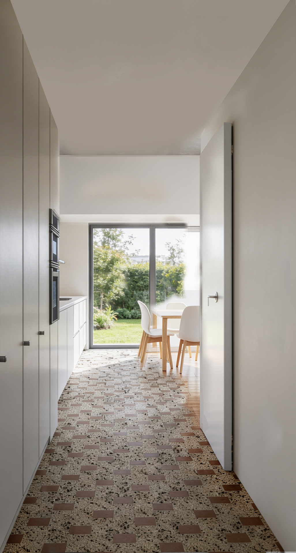 make the image more realistic the legs of the chairs are in light wood the seats of the chairs are white there is a garden outside the window