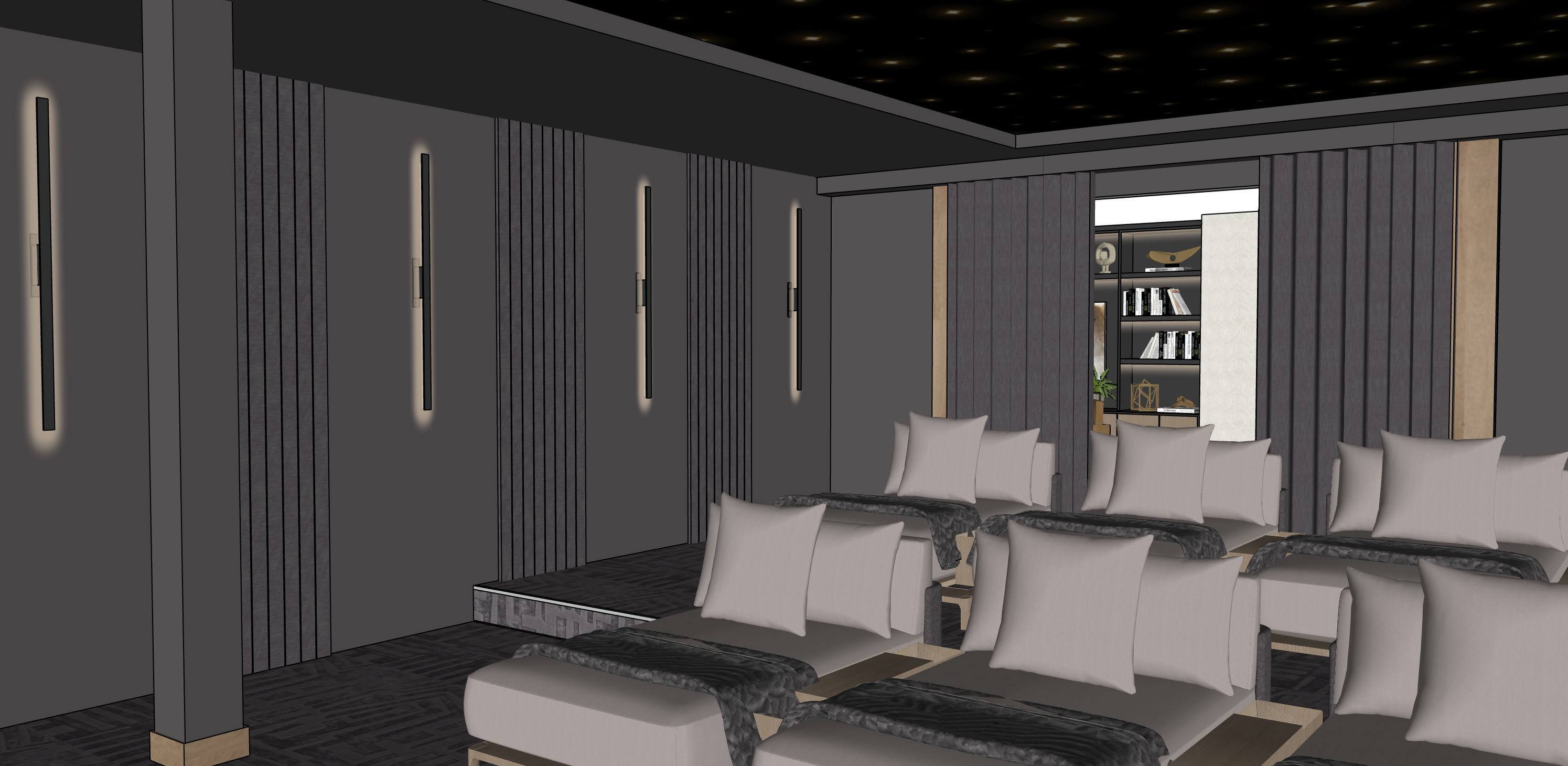 movie theatre room linear acoustic panels slim sconces starry ceiling