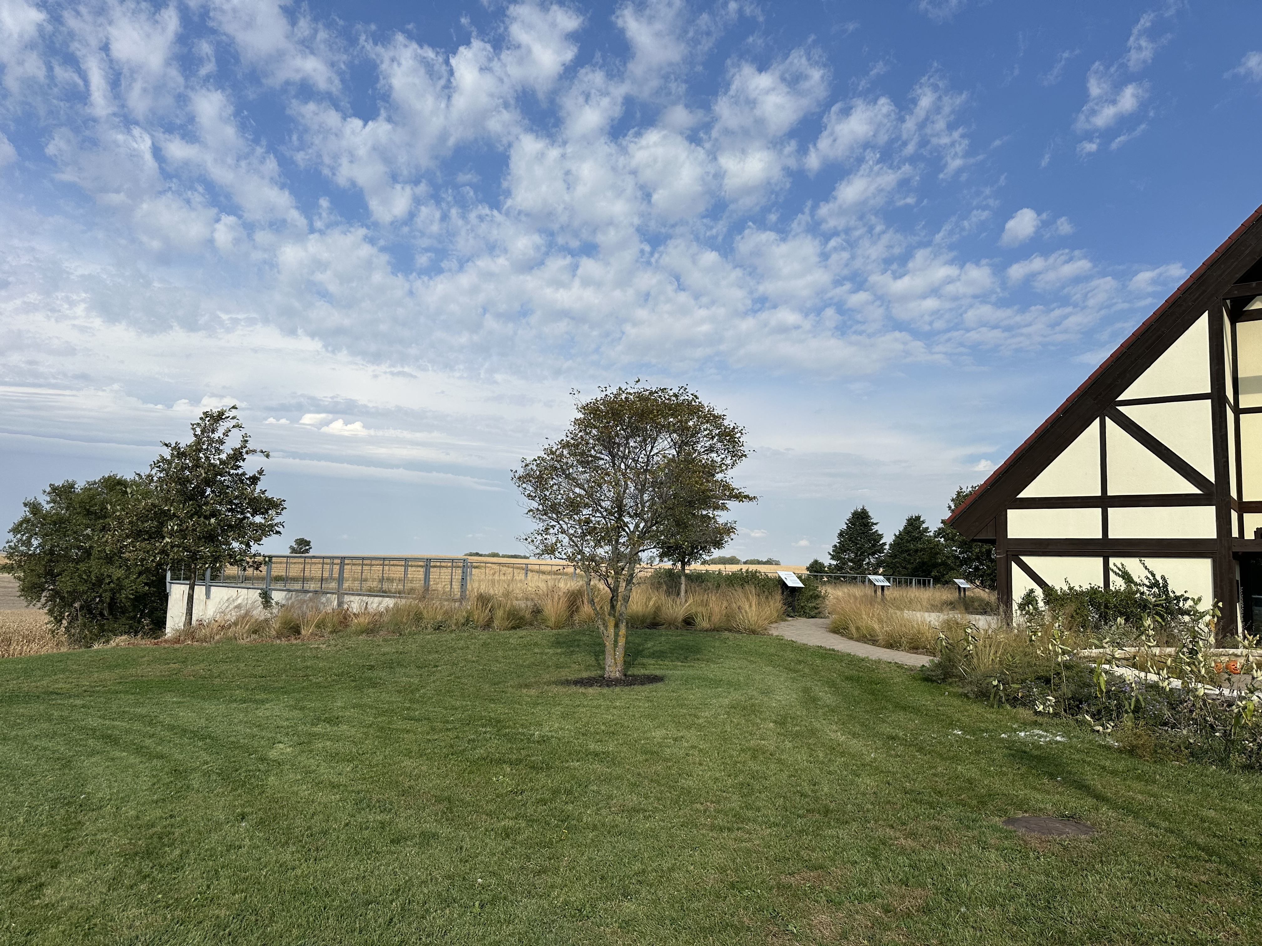 to left of existing building shoe a modern glass gabled structure that is shorter than existing builiding inside show a black ford model a sedan and a museum exhibition space with people connect addition to existing structure with glass connector show connector shorter gable structure larger show native prairie beds that extend around builiding no trees
