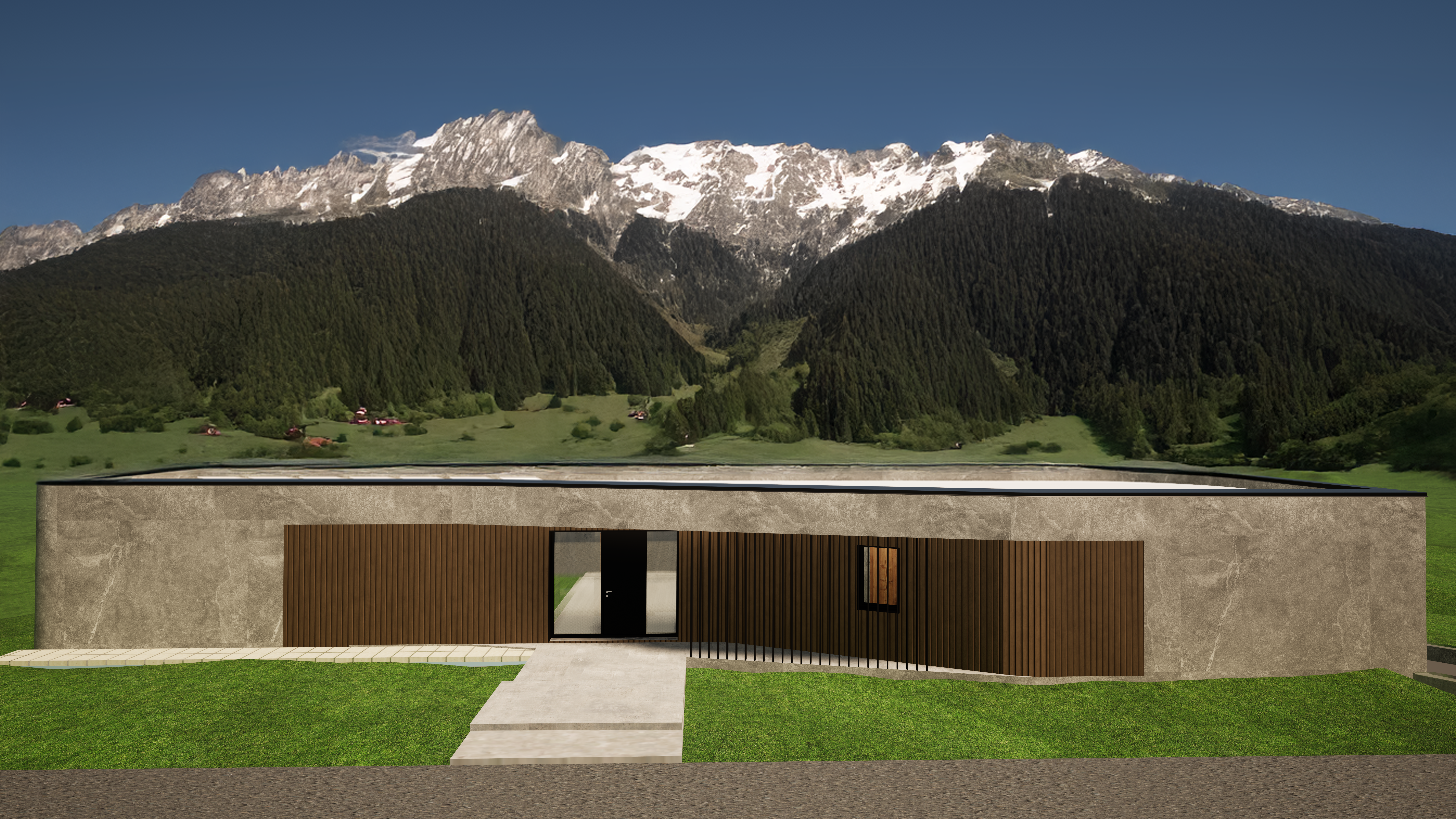 replace the wooden cladding with photorealistic vertical slatted wood showing natural tone variations and fine grain keep the existing stone wall texture from the photo completely unchanged replace the current background with a neutral minimal one soft grey or white to highlight the building ensure high resolution photorealistic architectural quality