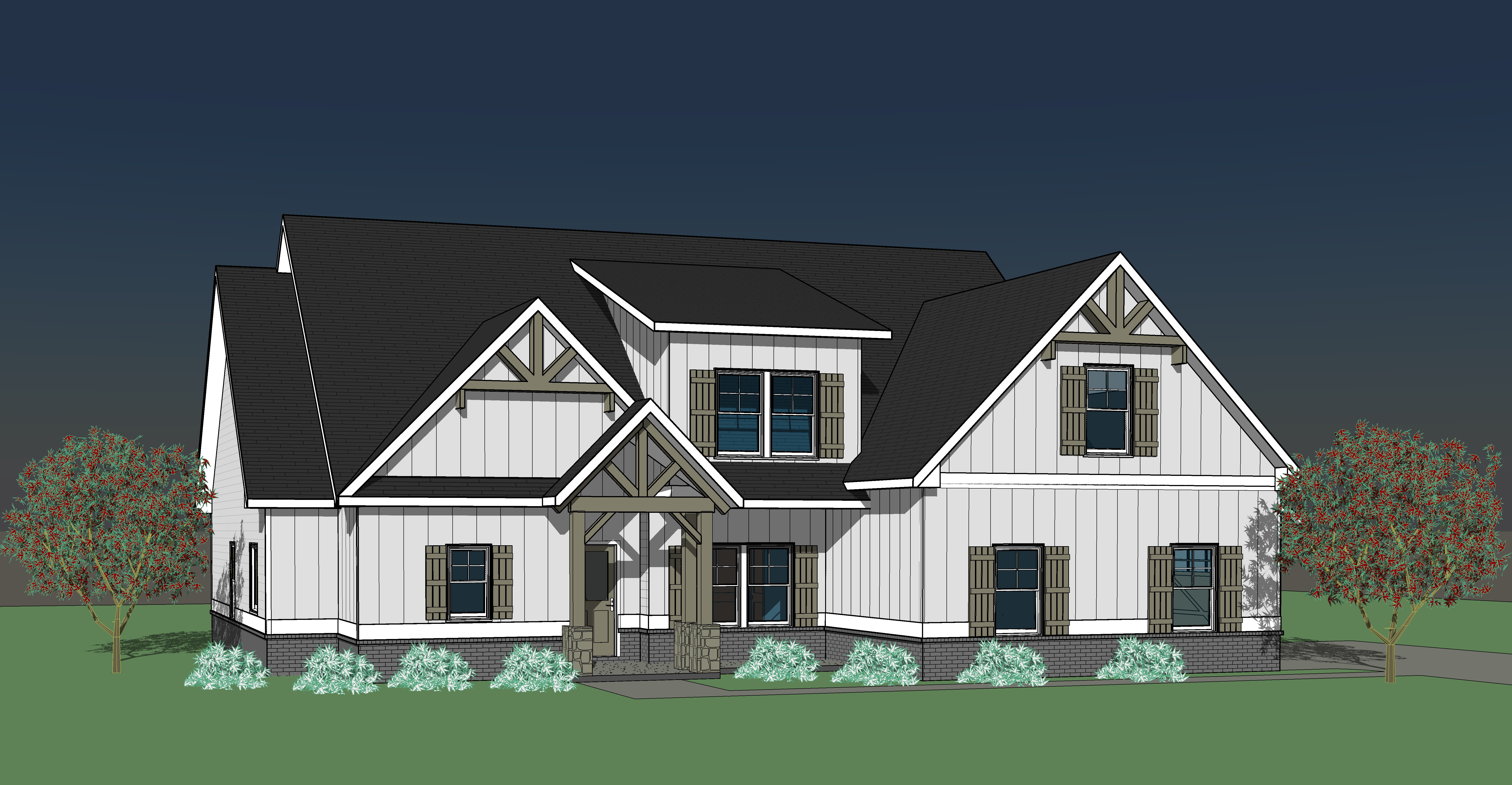 sunny sky with few clouds vibrant landscaping siding to be white brown brick base charcoal gray roof