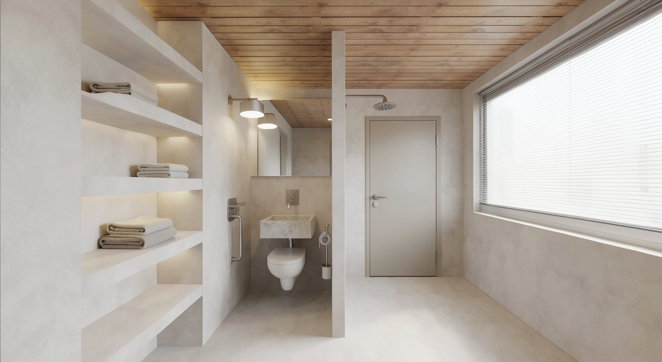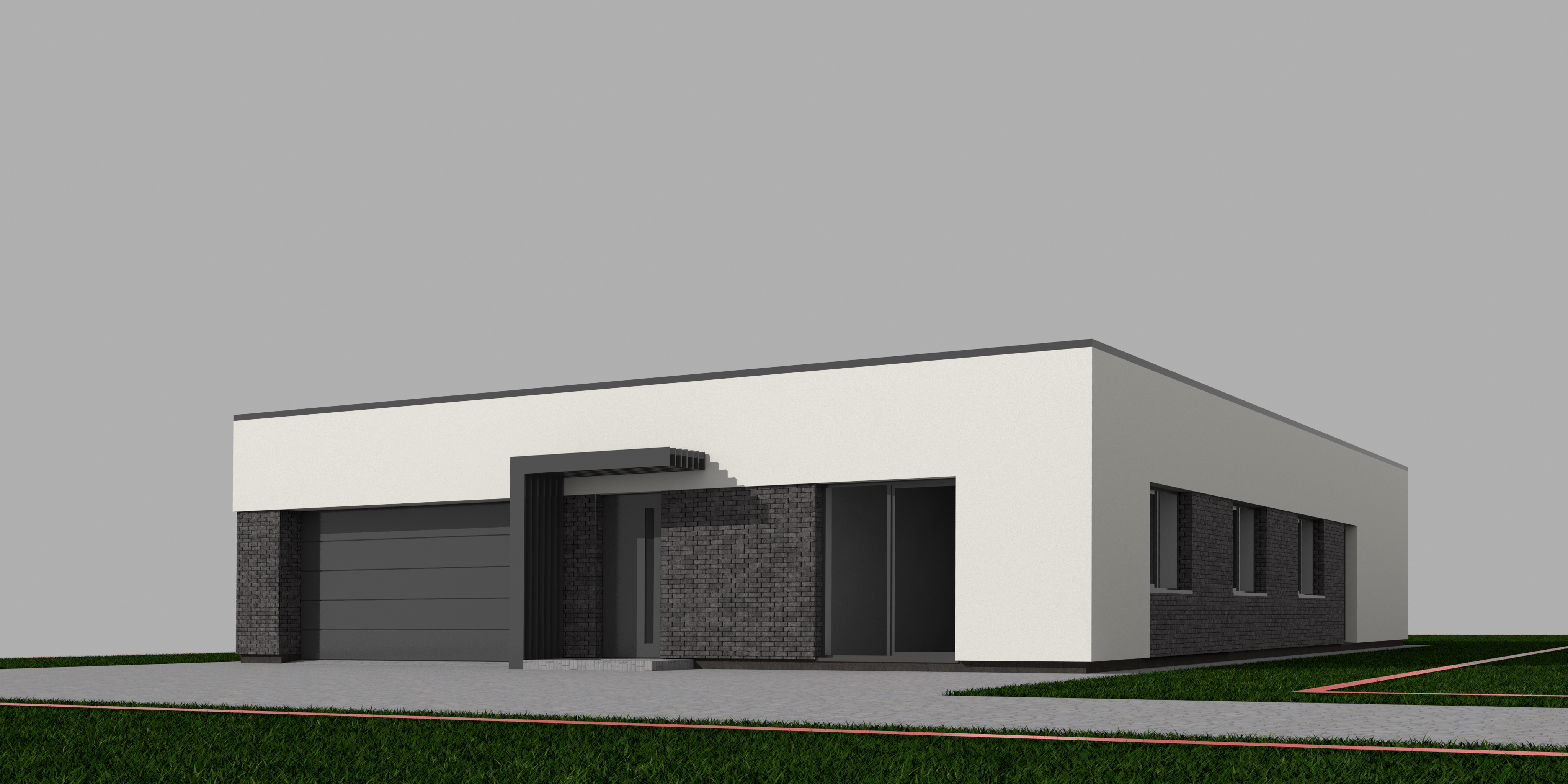 a modern minimalist single story house with a flat roof featuring a sleek white plaster facade and dark gray clinker on the part of the roof are installed solar panels the driveway is paved with light gray paving leading to a dark gray garage door the surrounding landscape includes lush green grass the atmosphere is serene and contemporary set on a mild summer noon with soft natural lighting enhancing the clean lines and contrasts of the architecture change red line to dark grey metal wire fence add some shrubs near the fence and add car near garage gate