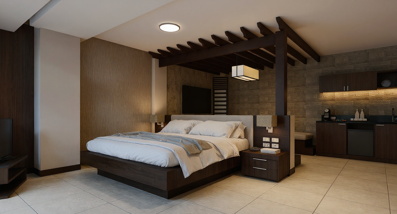 transform the provided restaurant interior image into a high end photorealistic render that reflects the brand setting and design ethos of the ledger an extended stay boutique hotel in boston s financial district the final image should express a warm golden hour atmosphere with soft glowing highlights and an elevated sense of boston heritage interpreted through contemporary craftsmanship and financial district sophistication maintain the exact spatial configuration of the original image keep all proportions geometry bar shape booth seating ceiling curves wall finishes yellow curtains materials and furniture positions exactly the same do not move or alter any objects color placements or architectural elements furniture materials boston specific adjustments all chairs must remain in their exact positions and proportions update materials only bar stools upholstered in rich reddish brown leather inspired by classic boston library chairs with a subtle natural sheen and cushioned texture club chairs upholstered in a linen like block print paisley add a large art piece on the blank wall at the back of the bar it should have a revolutionary theme