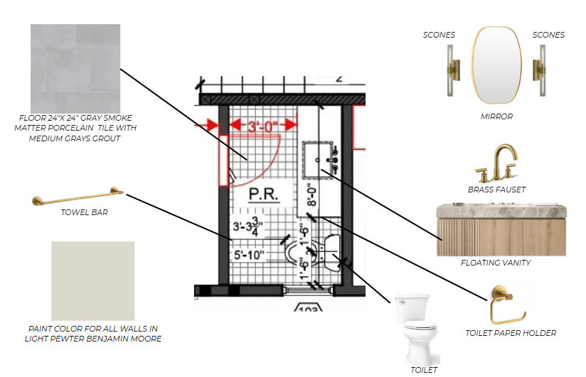 create a realistic 3d interior rendering of a small powder room based on the provided floor plan ceiling height is 9 0 layout floating vanity on the left wall with a marble countertop and light oak fluted wood base brass faucet centered on vanity mirror and sconces centered above vanity toilet positioned on the right side wall toilet paper holder mounted on the right side of the vanity facing the toilet towel bar centered on the wall behind the door materials floor 24 x24 gray smoke matte porcelain tile with medium gray grout walls benjamin moore light pewter fixtures all brass window 2 1 x 2 11 casement window head height at 7 0 use only the provided reference images for fixtures and finishes generate a realistic perspective view from the doorway