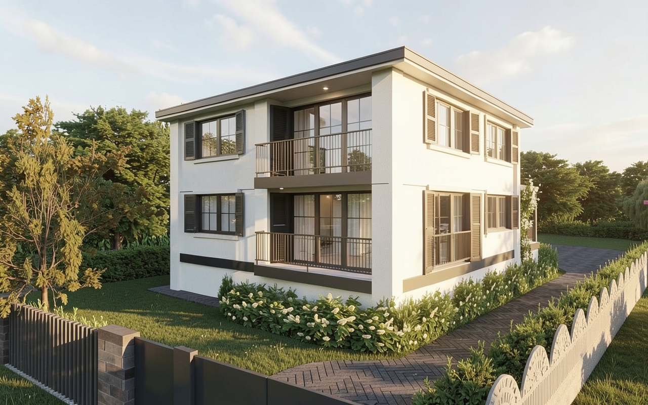 do not change the geometry create a modern office interior with a cozy atmosphere the flooring is a luxurious deep blue carpet the walls are a sophisticated slate gray providing a neutral backdrop with a framed scandinavian moss and a logo above a wooden desk with a rich walnut finish do not change the logo letters the ceiling features eye catching dark blue beams contrasting with a soft gray paint the armchair should be of brown leather material the curtains are from very dark grey textile on the left wall there is an art piece and the triangle forms are cut inward use ambient lighting for a warm inviting feel complemented by a modern black and white linear ceiling light fixtures