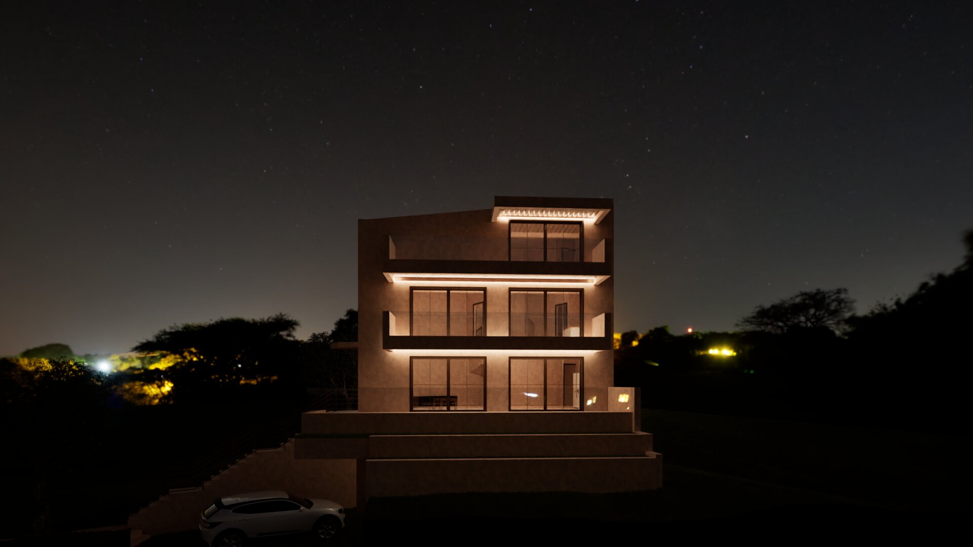 make it realistic add outdoor furniture at the balconies add curtain behind glazed windows add two people add short mediterranean vegetation at the grass and few trees keep the night sky